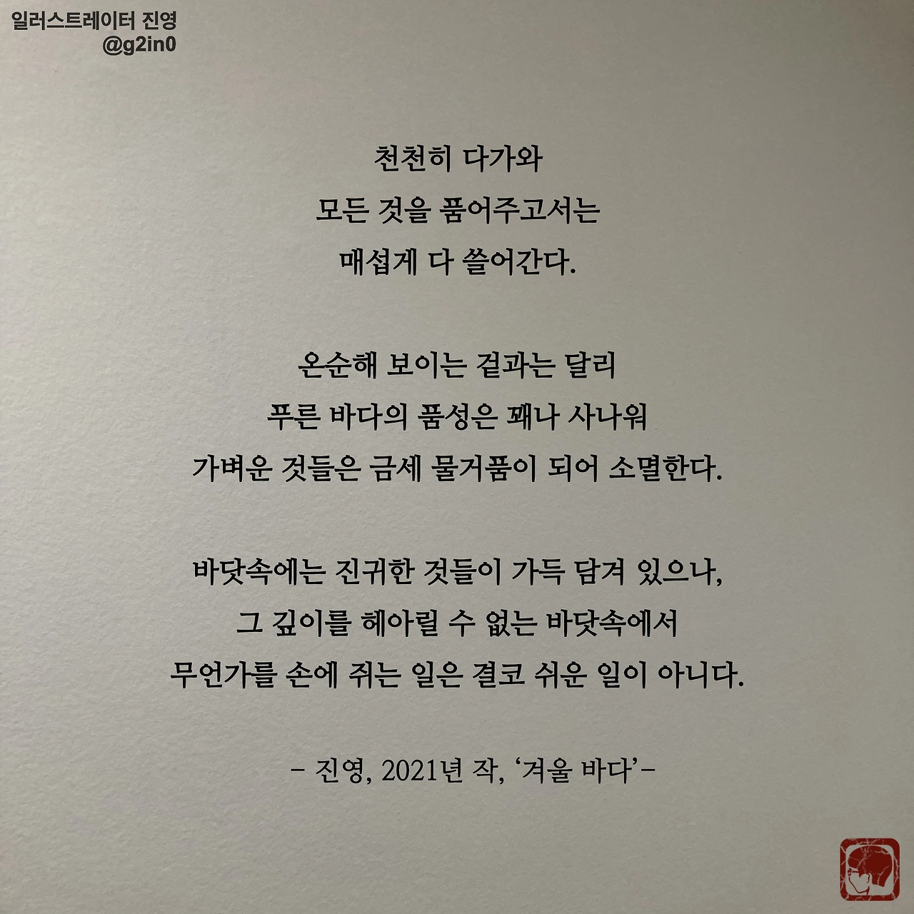 감성 글을 쓰고, 그림을 그립니다. 저의 작품이 누군가에게 그저 순간의 '기쁨', 혹은 '슬픔'이 되었다가 사라지기보다는 오랫동안 '좋음'으로 함께 했으면 좋겠습니다.