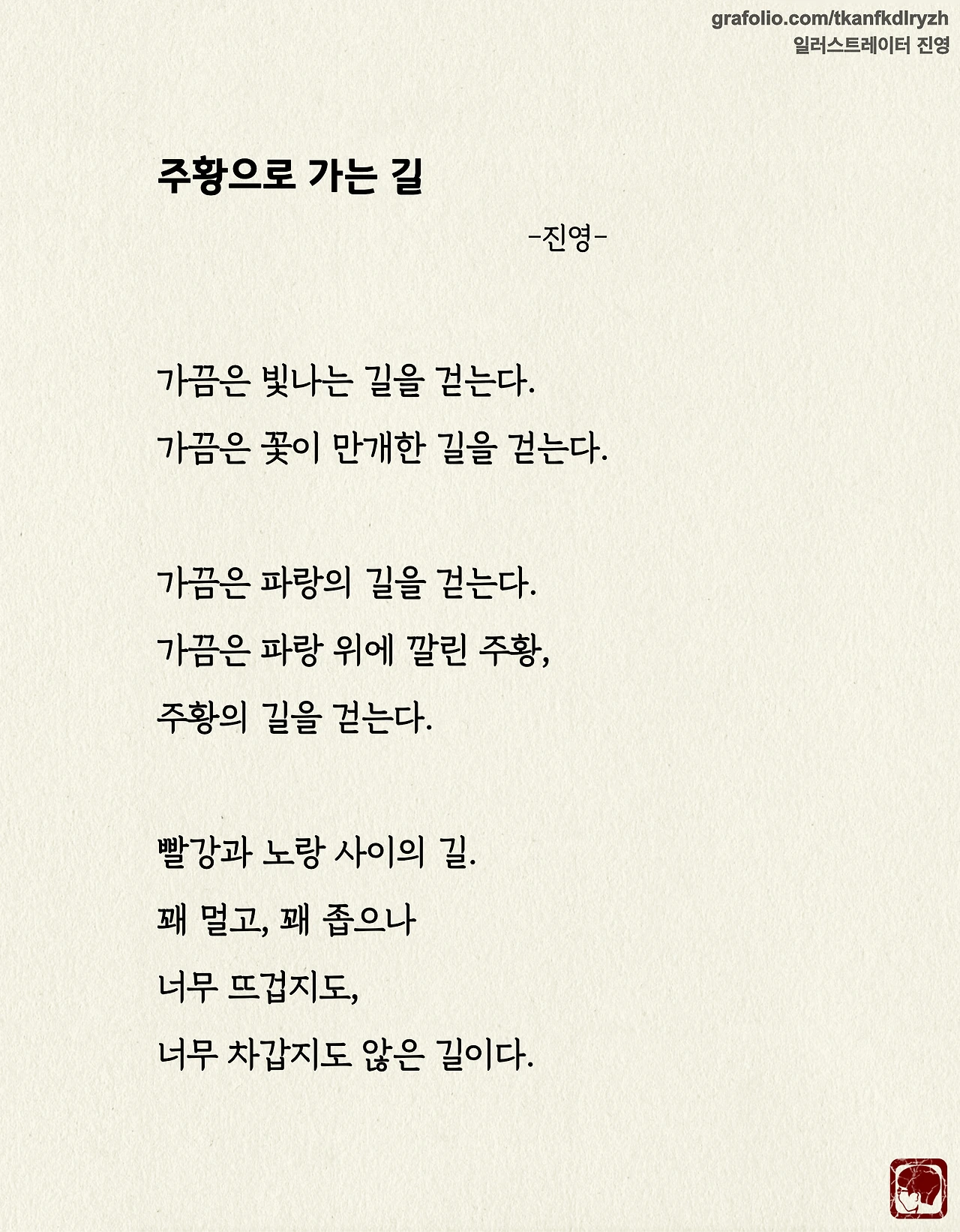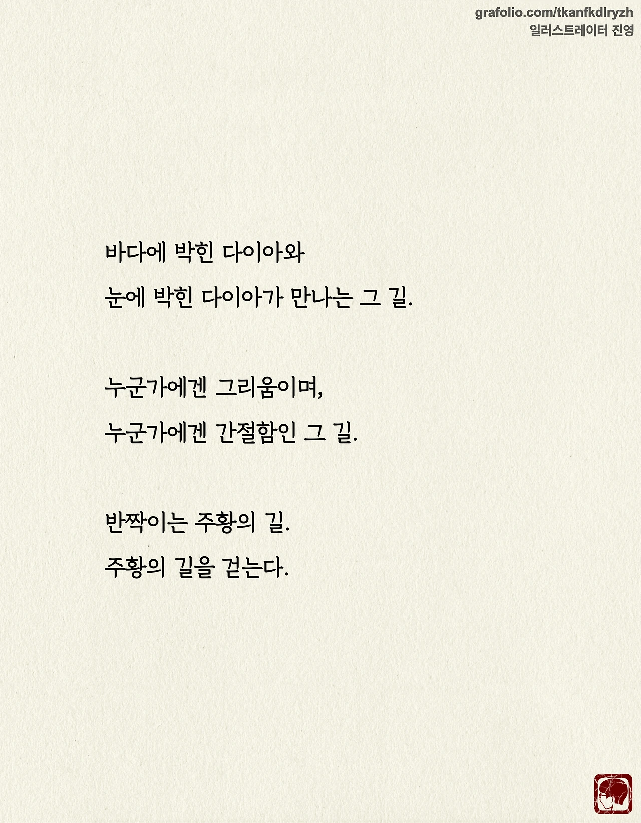 감성 글을 쓰고, 그림을 그립니다. 저의 작품이 누군가에게 그저 순간의 '기쁨', 혹은 '슬픔'이 되었다가 사라지기보다는 오랫동안 '좋음'으로 함께 했으면 좋겠습니다.
