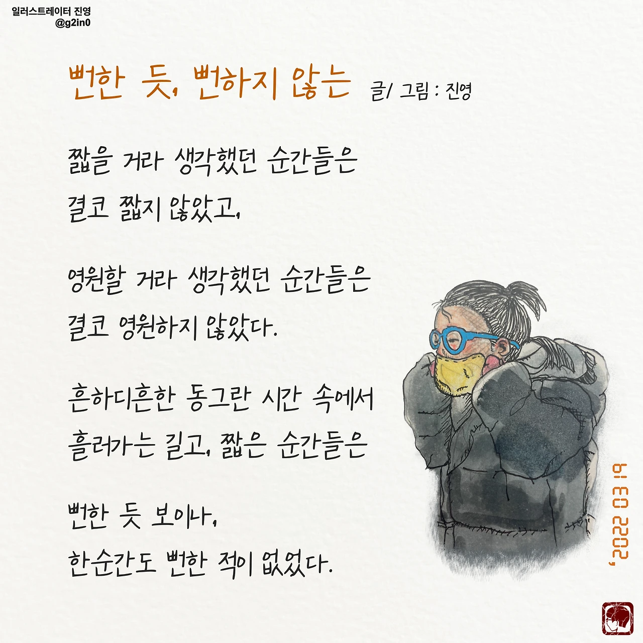 감성 글을 쓰고, 그림을 그립니다. 저의 작품이 누군가에게 그저 순간의 '기쁨', 혹은 '슬픔'이 되었다가 사라지기보다는 오랫동안 '좋음'으로 함께 했으면 좋겠습니다.