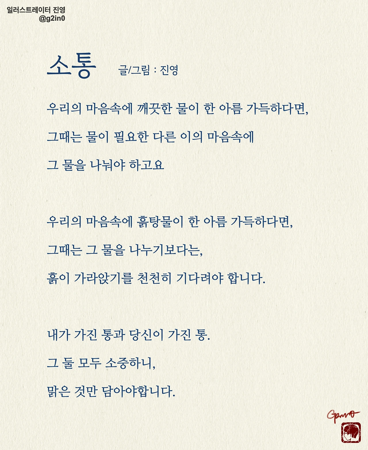 감성 글을 쓰고, 그림을 그립니다. 저의 작품이 누군가에게 그저 순간의 '기쁨', 혹은 '슬픔'이 되었다가 사라지기보다는 오랫동안 '좋음'으로 함께 했으면 좋겠습니다.