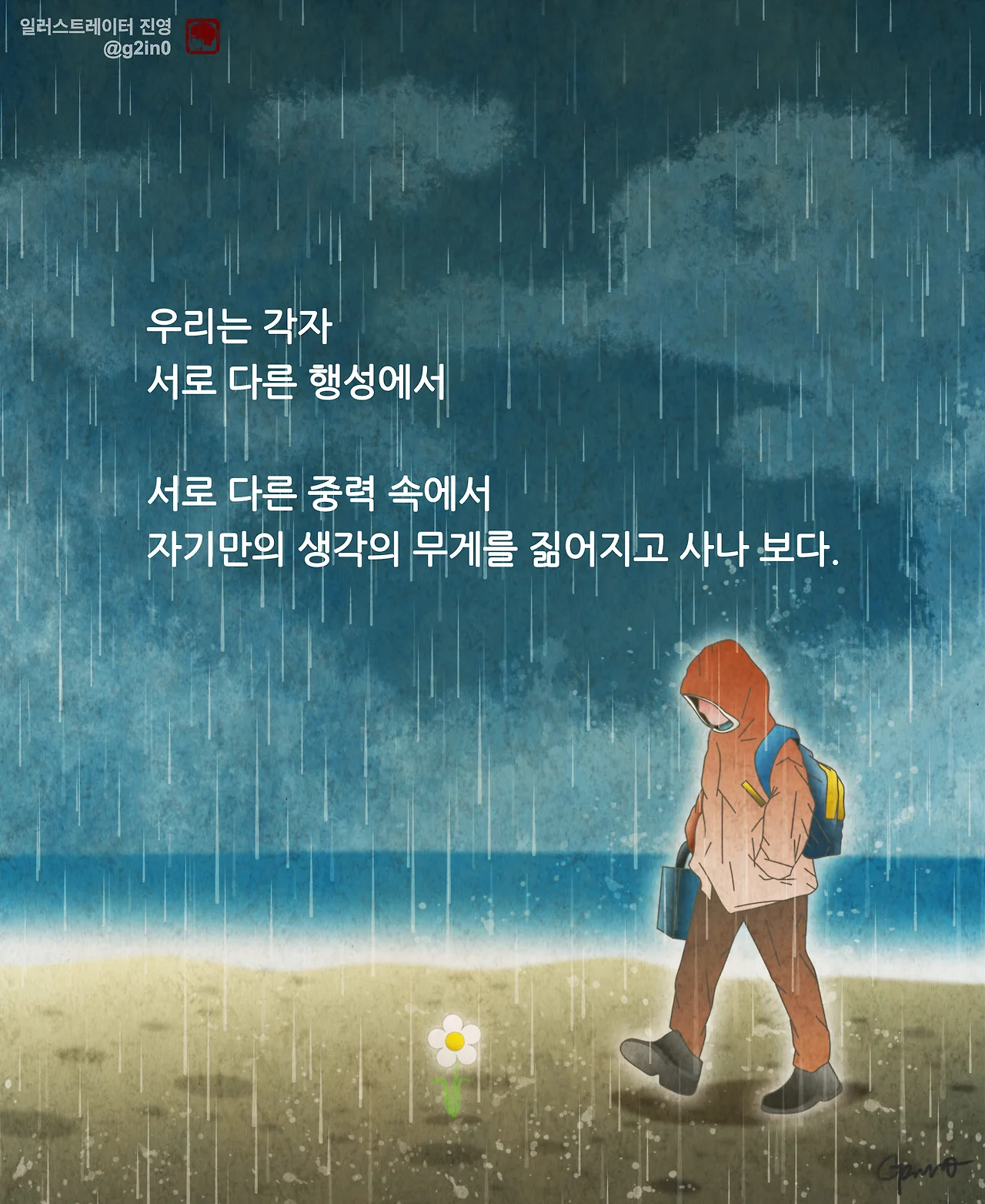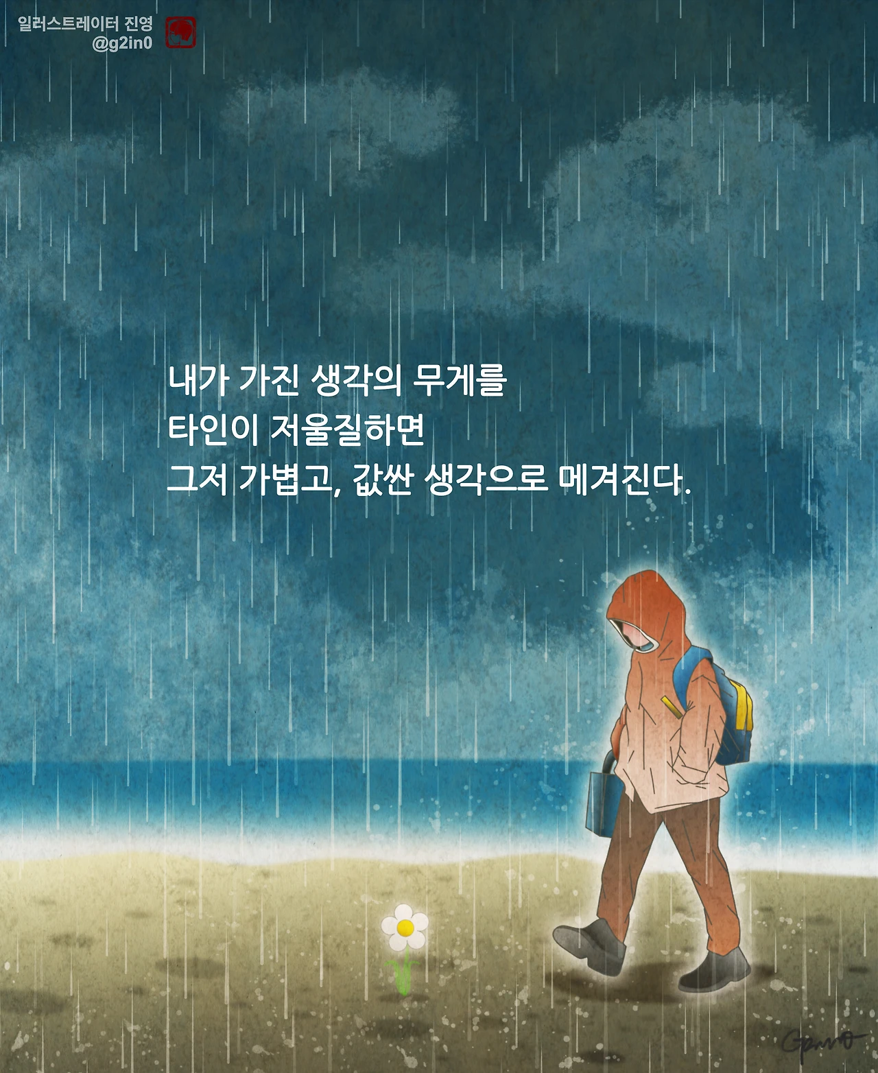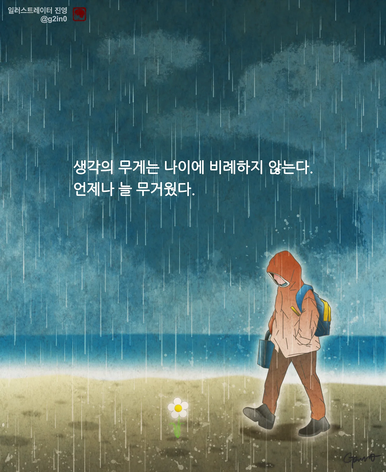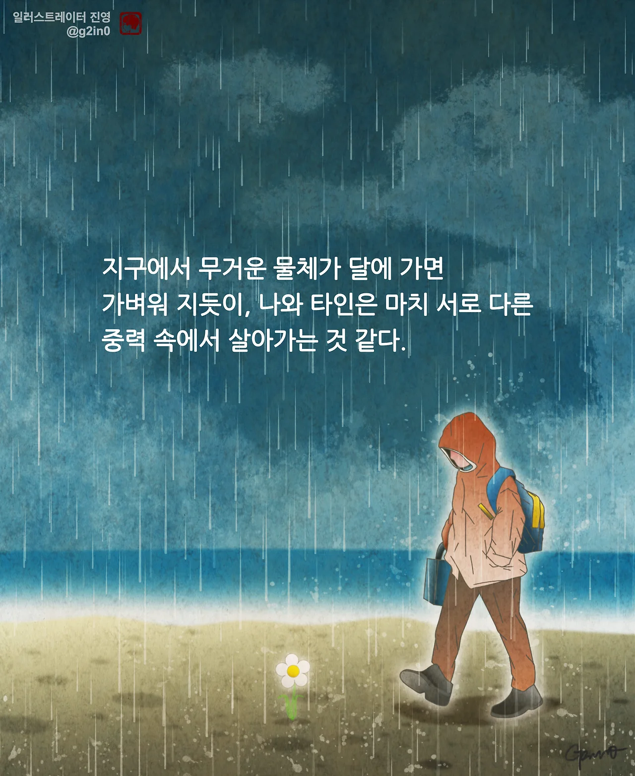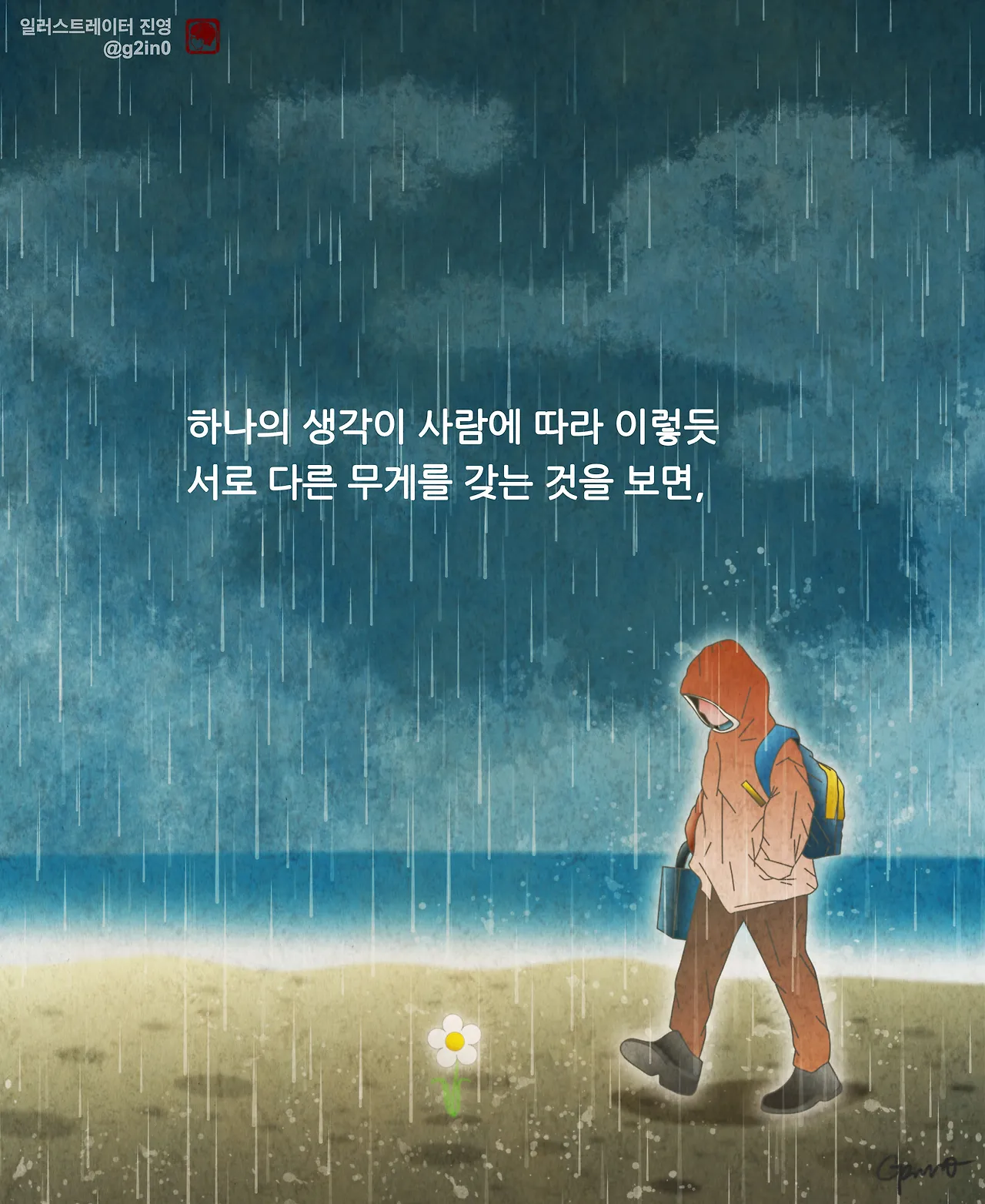 그런데 생각해 보면, 그림을 그리면서부터는, 운이 꽤 많이 따랐다. 솔직히 실력으로만 따지면, 뛰어난 사람이 넘치고 넘치는 것이 바로 이 예술계였다. 감사하게도, 운이 좋아 연재 공모전에서 당선되어 2019년에는 매주 목요일 글귀가 담긴 일러스트를 연재하게 되었다.