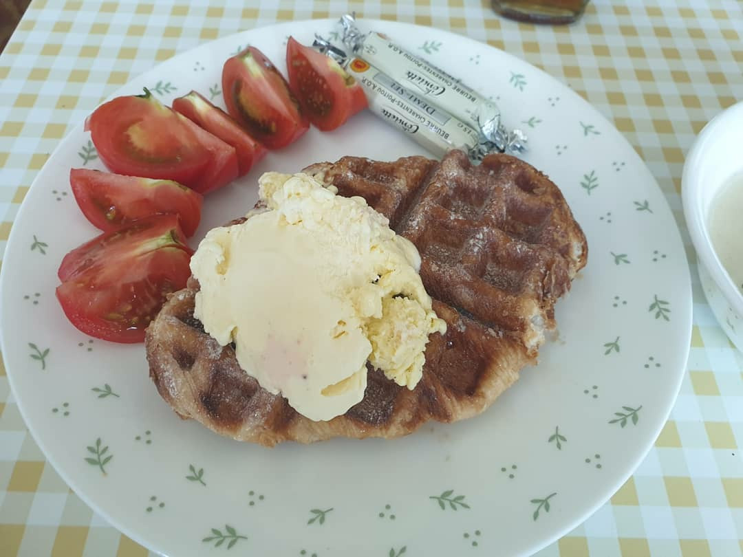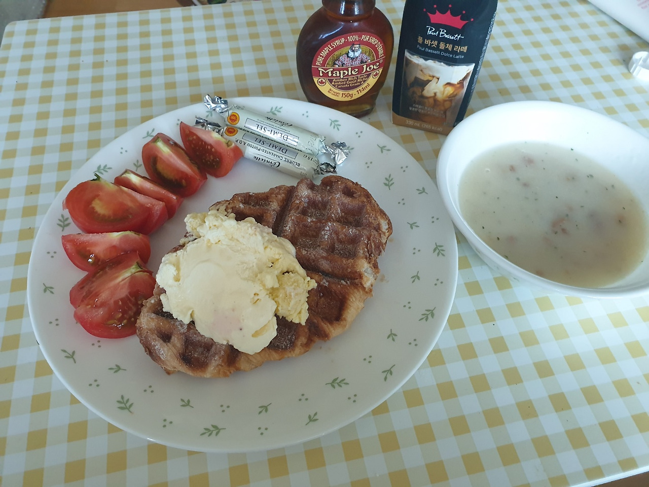오전-스프, 와플, 바닐라아이스크림, 토마토, 버터