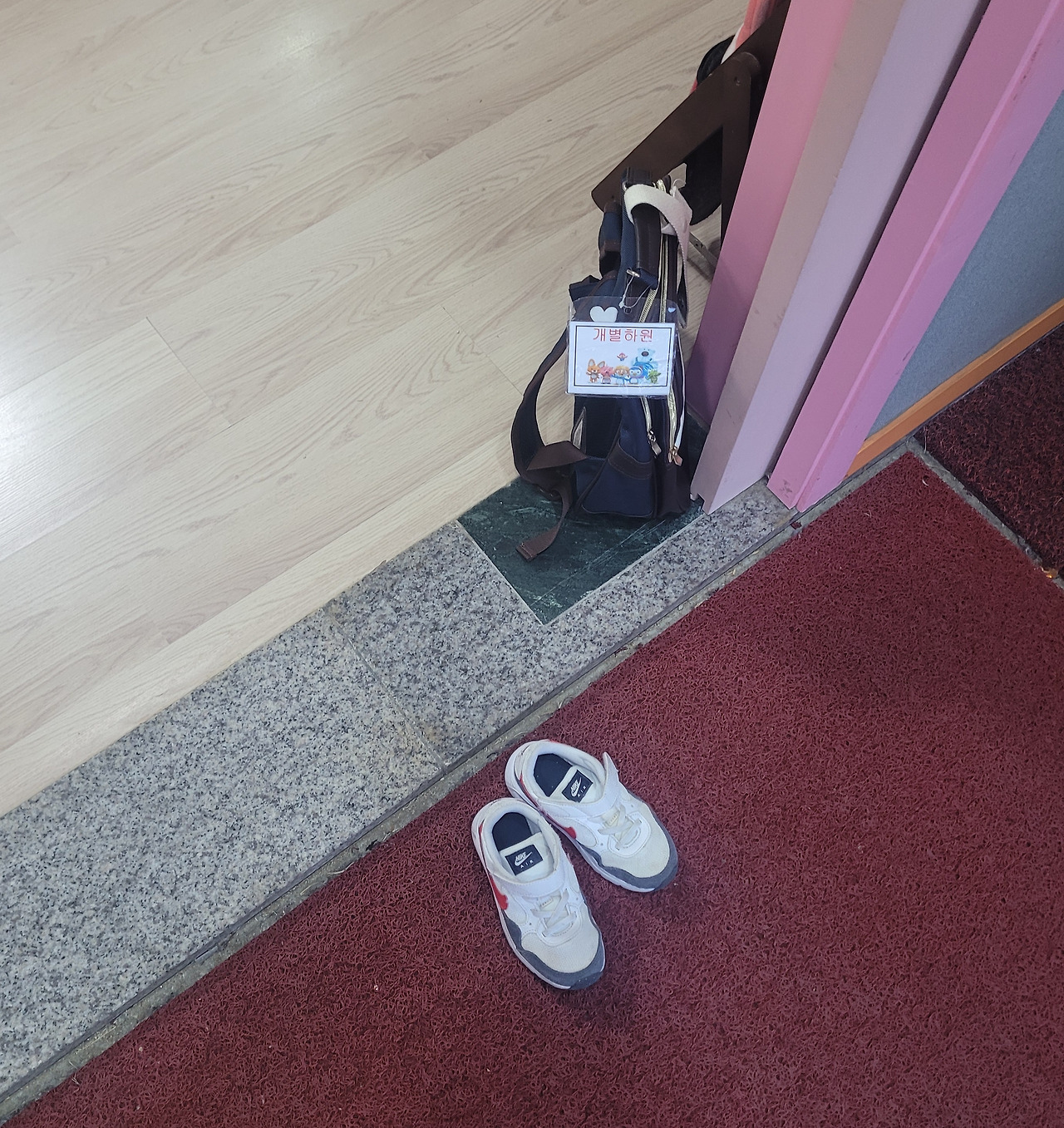유치원 입구에 덩그러니 놓여 있는 아이 신발과 가방