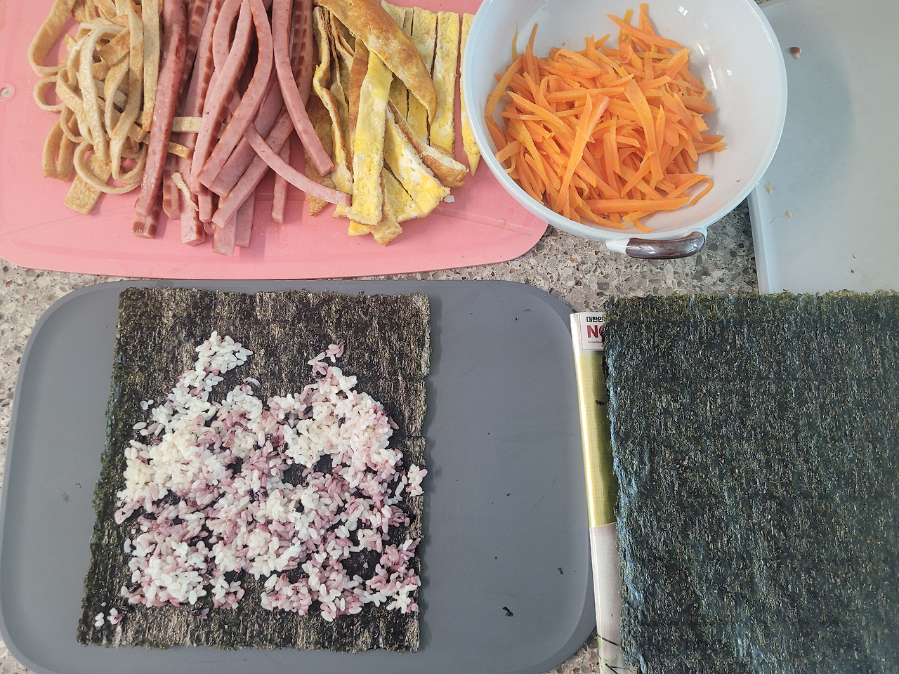 오늘은 아이와 놀이공원에 가기로 한 날이다. 오후 입장할 예정이라 시간은 여유롭다. 아침 겸 점심을 김밥으로 해결하고 도시락을 싸기로 했다. 냉장고에 있는 재료로만 만들었는데, 단무지가 없다는 걸 뒤늦게 알았다. 사실 단무지 없어도 맛있다.