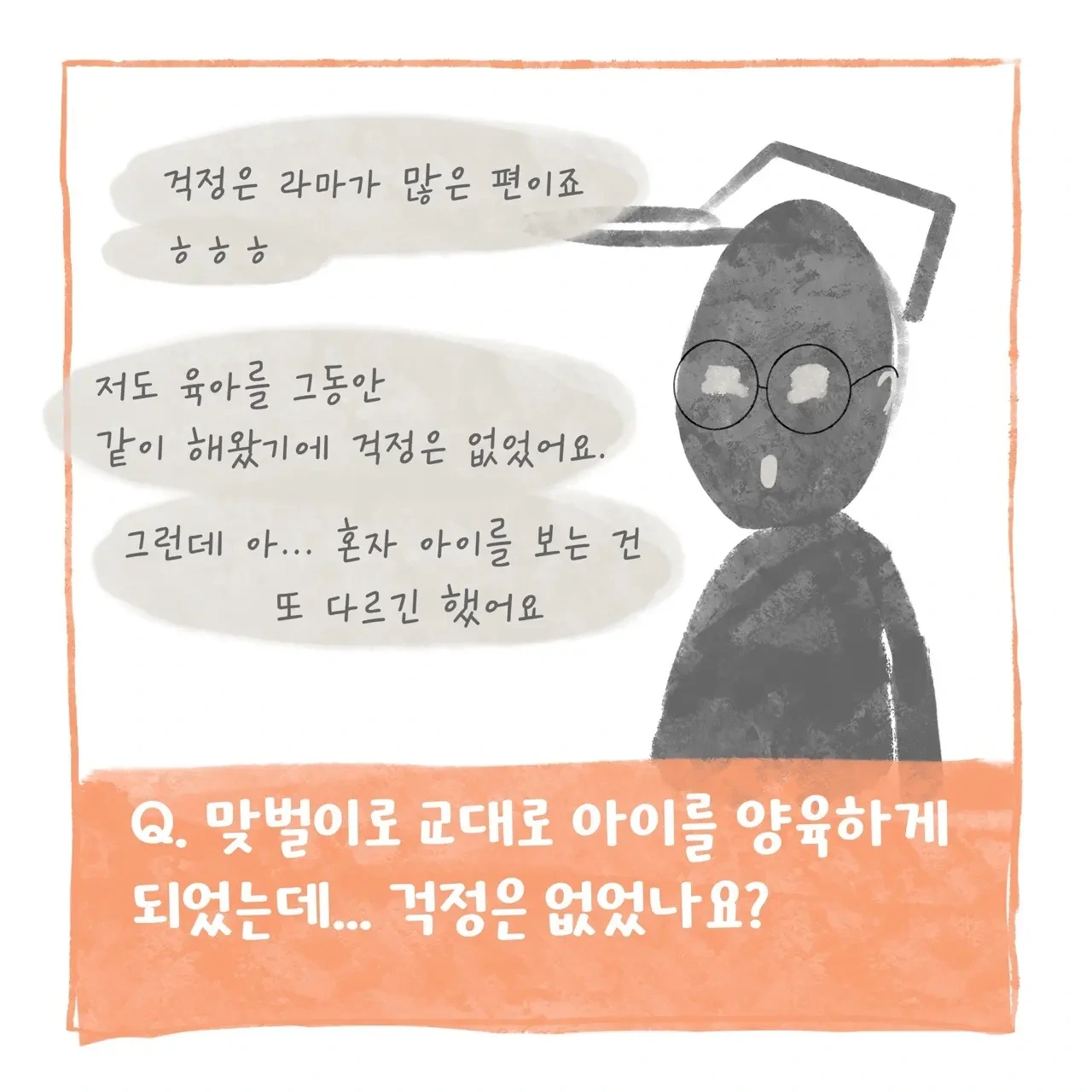 아빠 입장에서 주 양육자인 엄마의 육아를 돕는 것과 홀로 아이를 보는 것은 상황이 다르다. 사실 나의 마음은, 남편이 그걸 알아주길 바랐다. 약 9개월의 시간 동안 남편이 없는 시간에 홀로, 밤에도 홀로 아이와 보낸 시간이 힘들지 않았다면 거짓말이다. 어린이집에 아이를 보내두고 나의 시간을 갖는 것, 나의 일을 할 수 있다는 것이 무척 기다려온 것도 사실이다.