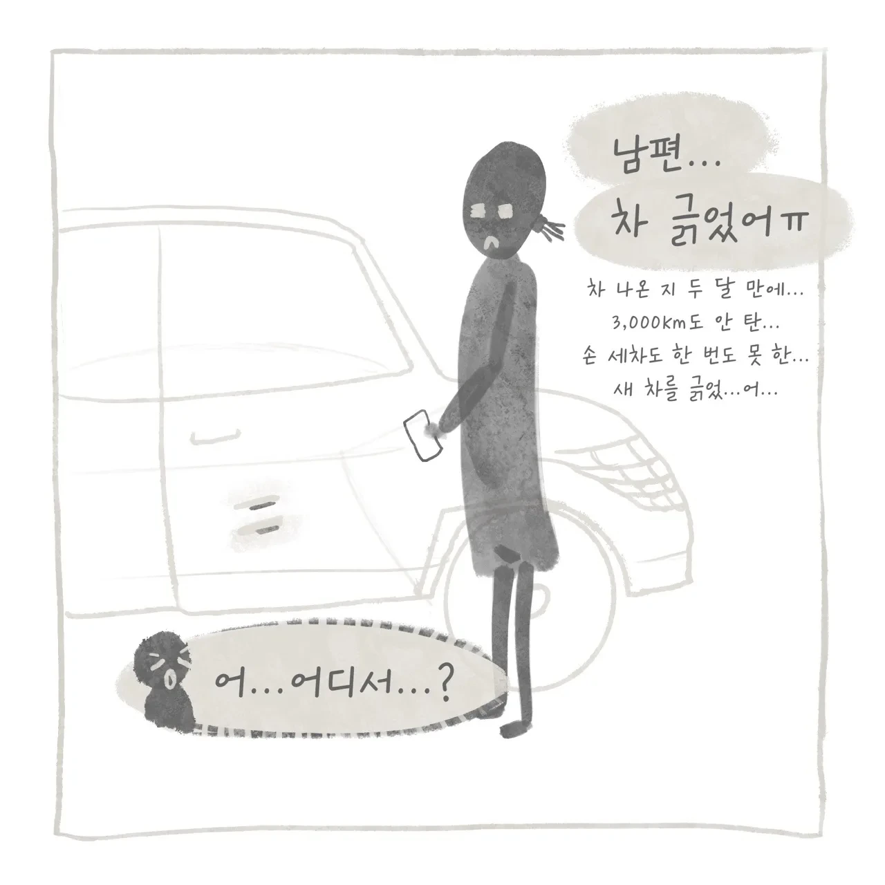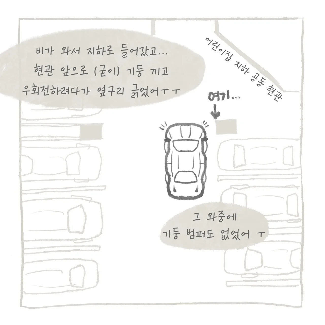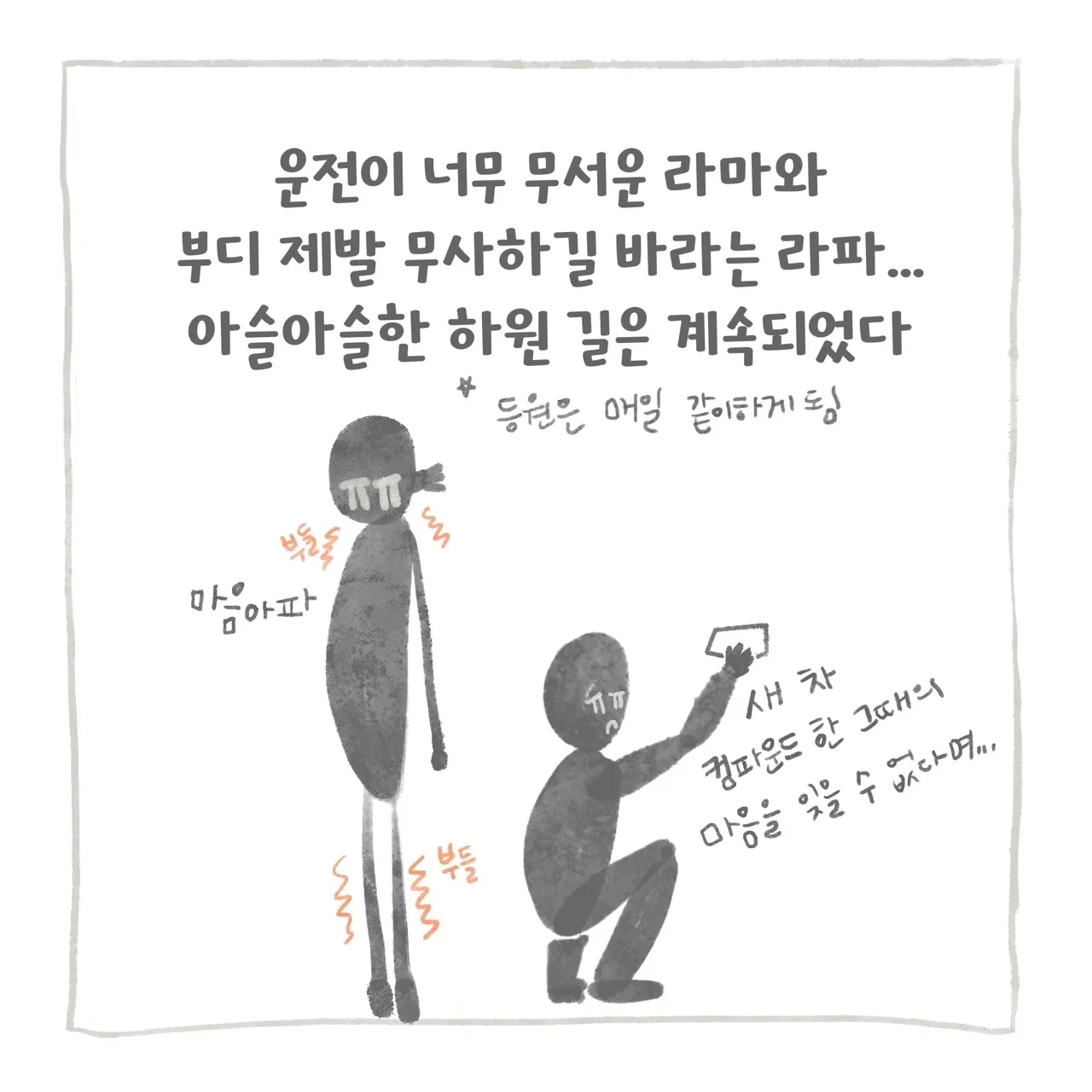 새 차 나온 지 두 달 정도 된, 3,000km도 안 탄... 정말 새 차 옆구리를 벅 긁어버린 라마. 라파는 물건을 깔끔히, 소중히 쓰는 타입이라 애지중지하는데 세차도 한번 못 해보고 컴파운드부터 하게 되었다며 속상해했다. 그 이후에도 월요일, 금요일 빠방 수난시대는 계속되는데... 언제쯤 익숙한 등원, 하원길이 될 것인가.(ㅠ)