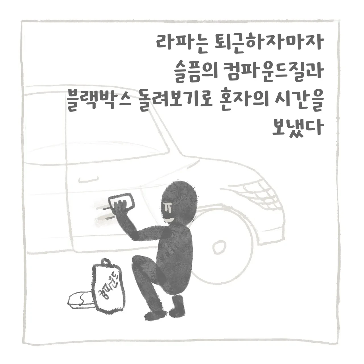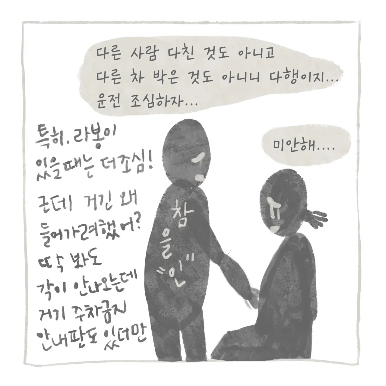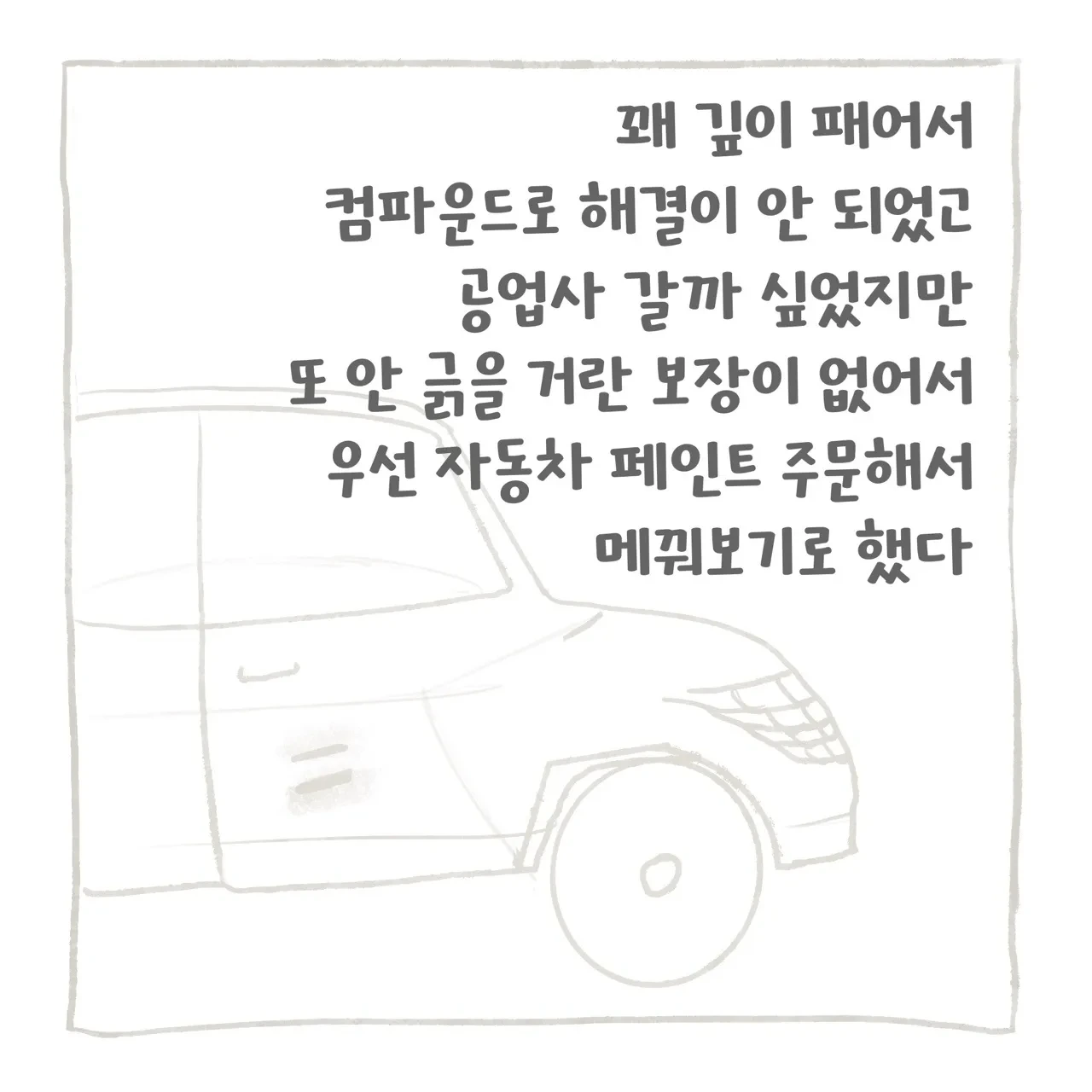 새 차 나온 지 두 달 정도 된, 3,000km도 안 탄... 정말 새 차 옆구리를 벅 긁어버린 라마. 라파는 물건을 깔끔히, 소중히 쓰는 타입이라 애지중지하는데 세차도 한번 못 해보고 컴파운드부터 하게 되었다며 속상해했다. 그 이후에도 월요일, 금요일 빠방 수난시대는 계속되는데... 언제쯤 익숙한 등원, 하원길이 될 것인가.(ㅠ)