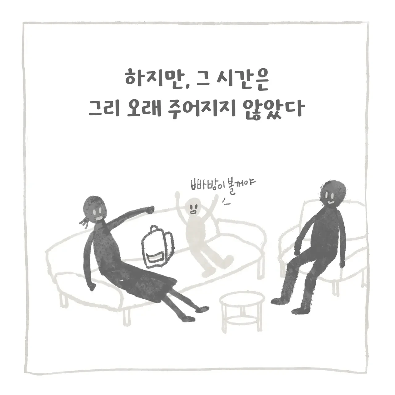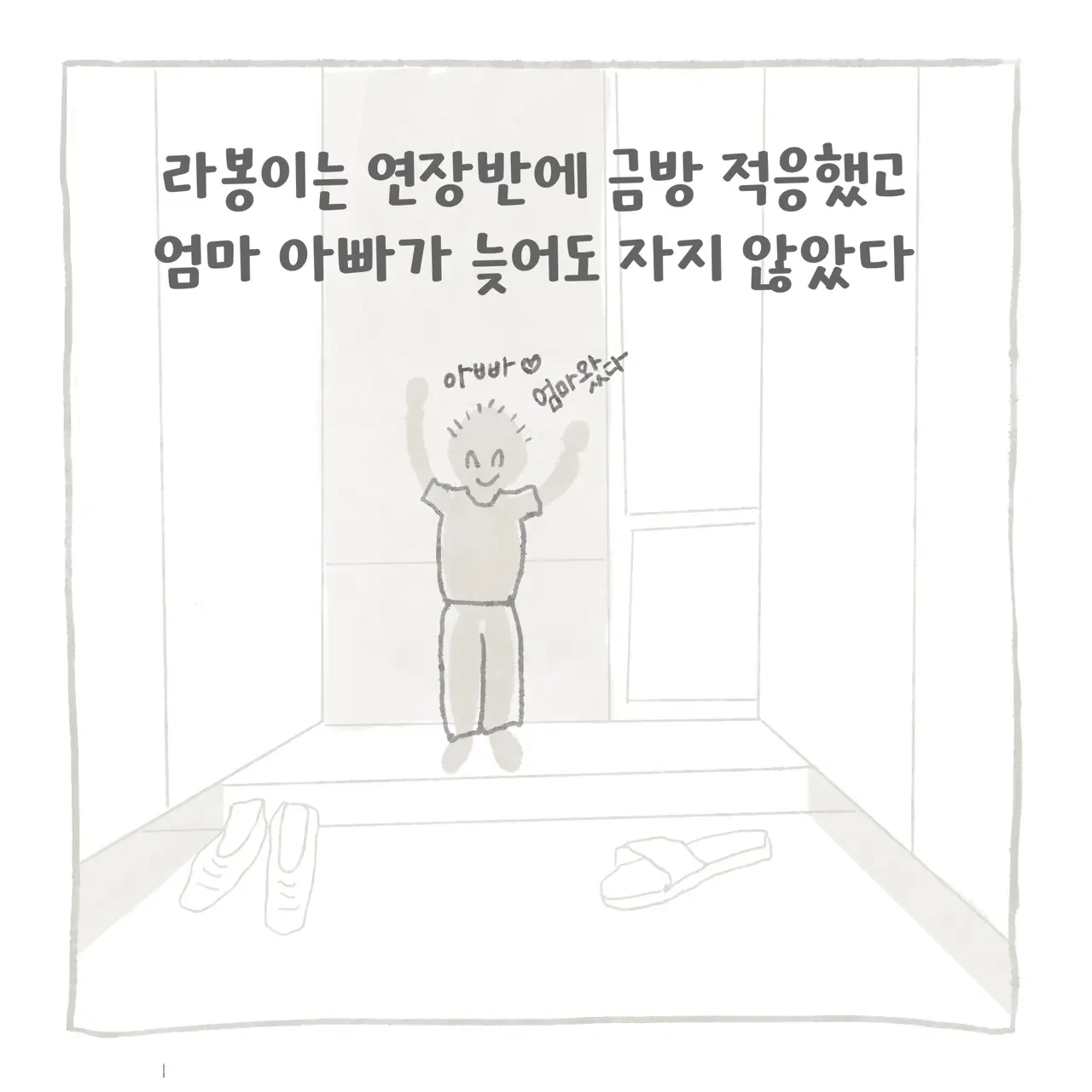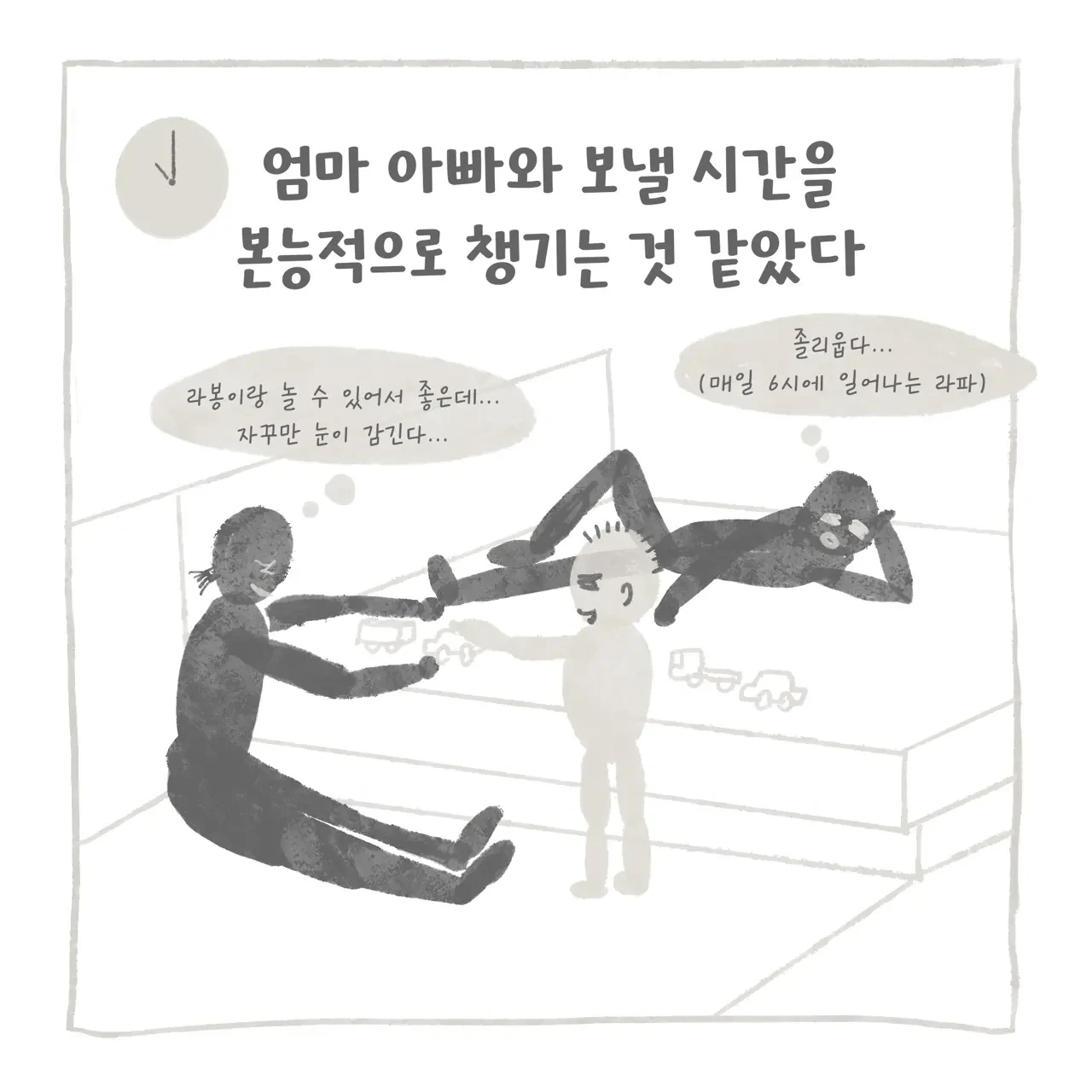 아이는 금세 어린이집 연장반에 적응했고, 마치 엄마가 언제 오나 확인하는 듯 잠을 자지 않았다. 피곤한 눈덩이를 간신히 버티며, 조금은 짜증 섞인 상태로 그렇게 버티고 있었다. 엄마 또는 아빠와 마주한 시간부터 일정 시간은 함께 놀아야 했고, 그러니 늦게 들어온 사람은 씻기를 마다하고 아이와 시간을 보낸다. 일단 빨리 아이의 욕구를 채워준 후에 재우는 것이 중요했다.