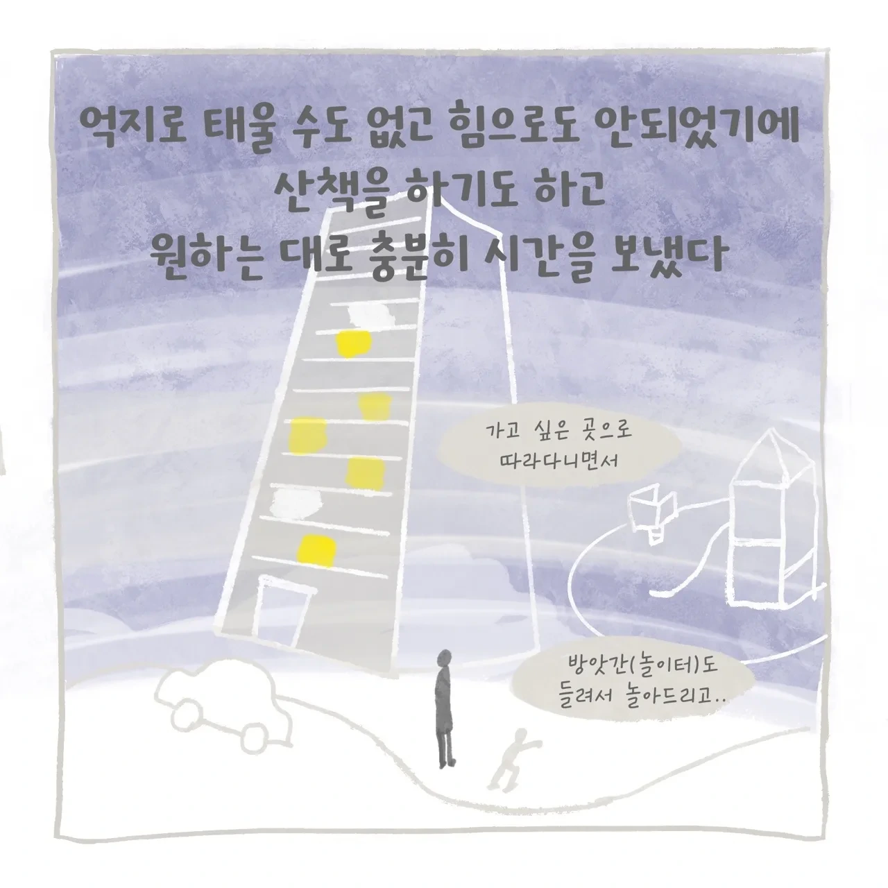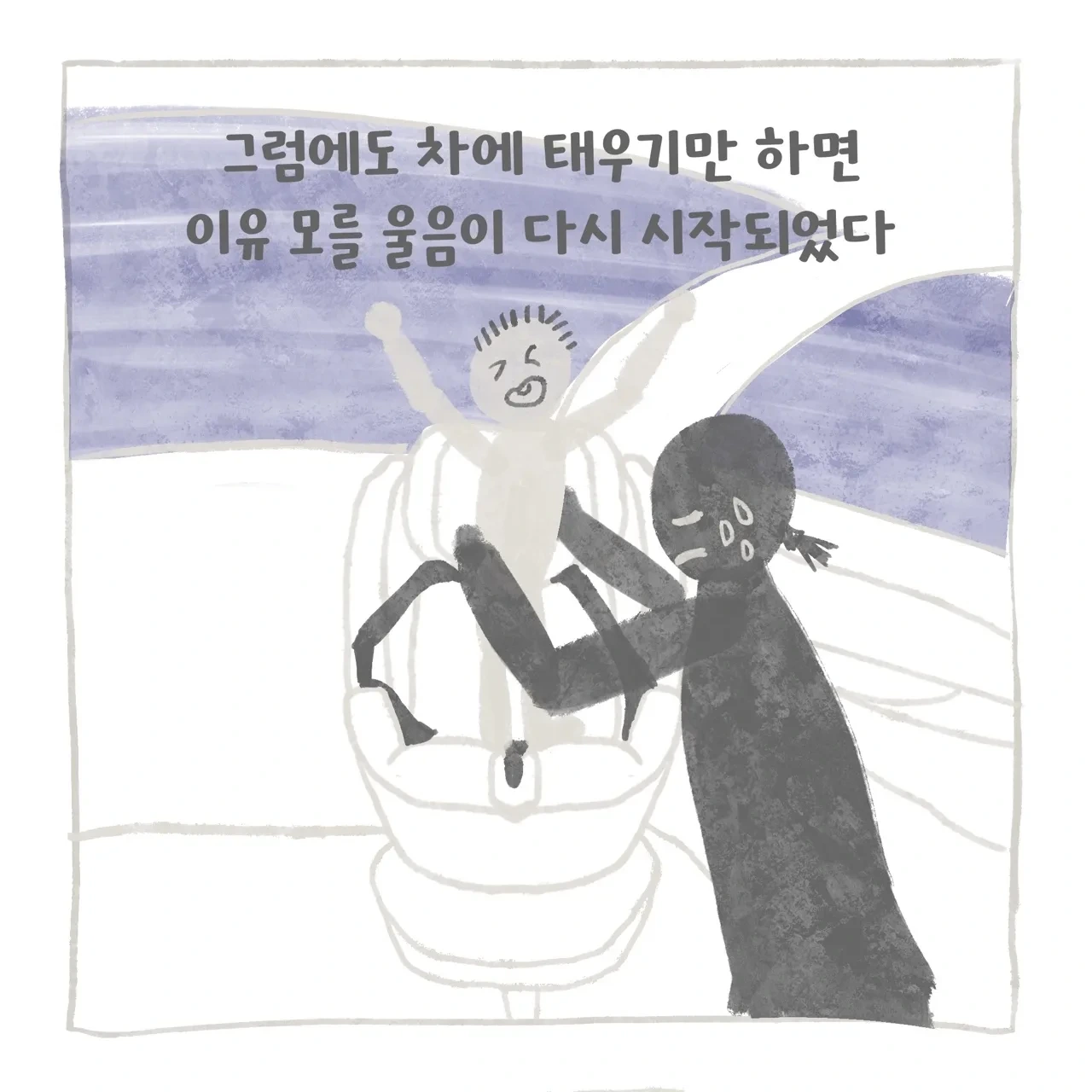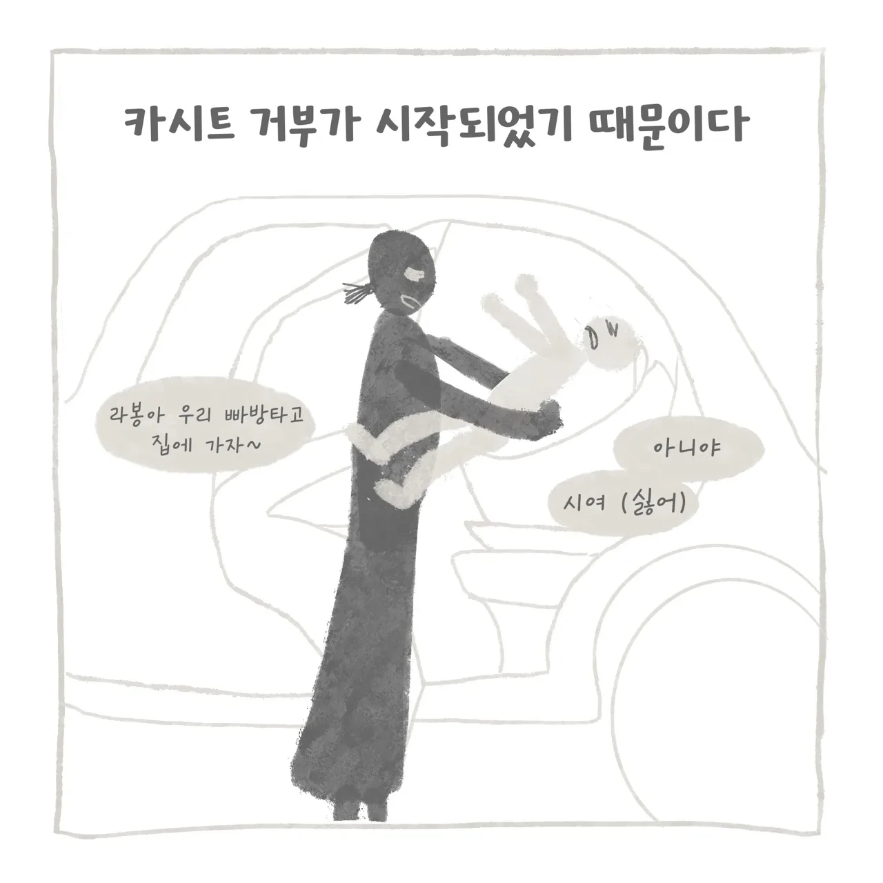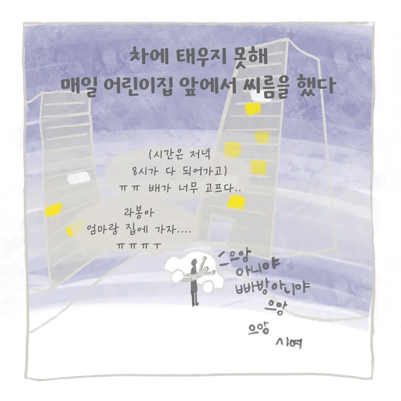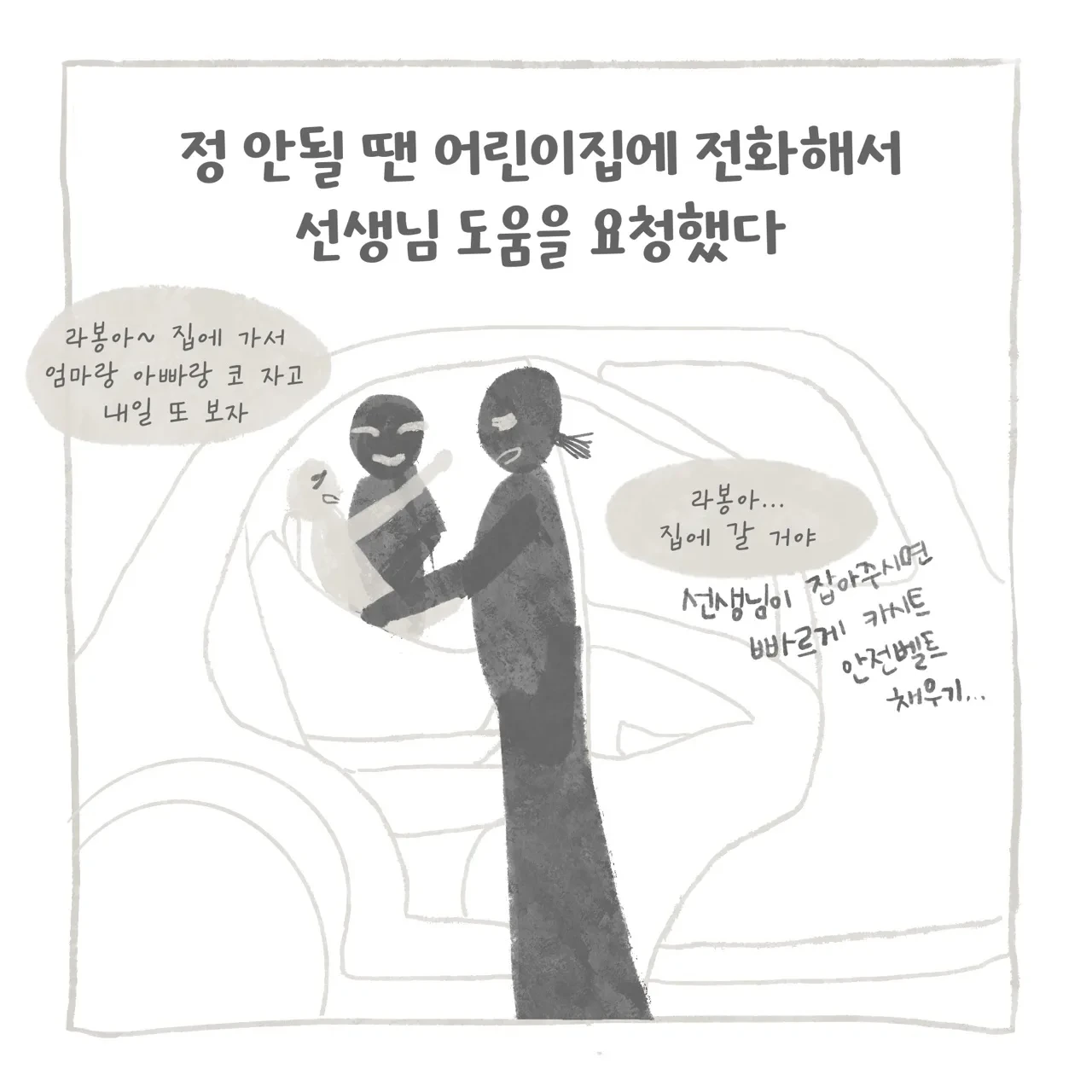 퇴근 후 집에 가고 싶은 엄마 VS 엄마랑 밖에서 더 놀고 싶은 아이... 사실 엄마는 서로 피곤하고 배도 고프고 집에 가고 싶은 마음 때문에 더 아이에게 여유를 주지 못했을 수 있다. 그런데 아이도... 저녁 7시 30분까지 아이는 어린이집에 있었고 엄마를 만나니 더 투정을 부리는 건가 싶기도 하고... 이유를 그 당시에는 도무지 알 수 없었다. 하지만 카시트를 안 하는 건 허용할 수 없는 영역이었기에 회유하고 달래기도 하고 화도 내기도 하고 참... 매일이 씨름이었다. 어느 날은 해가 뉘엿뉘엿 지고 어린이집 앞에서 아이를 안고 같이 울어버렸다. (ㅠ)