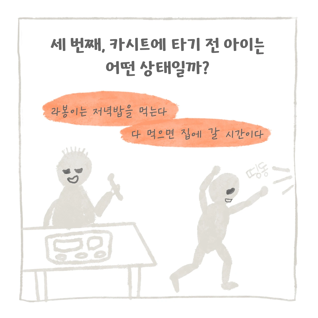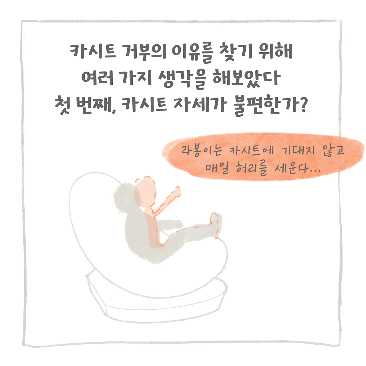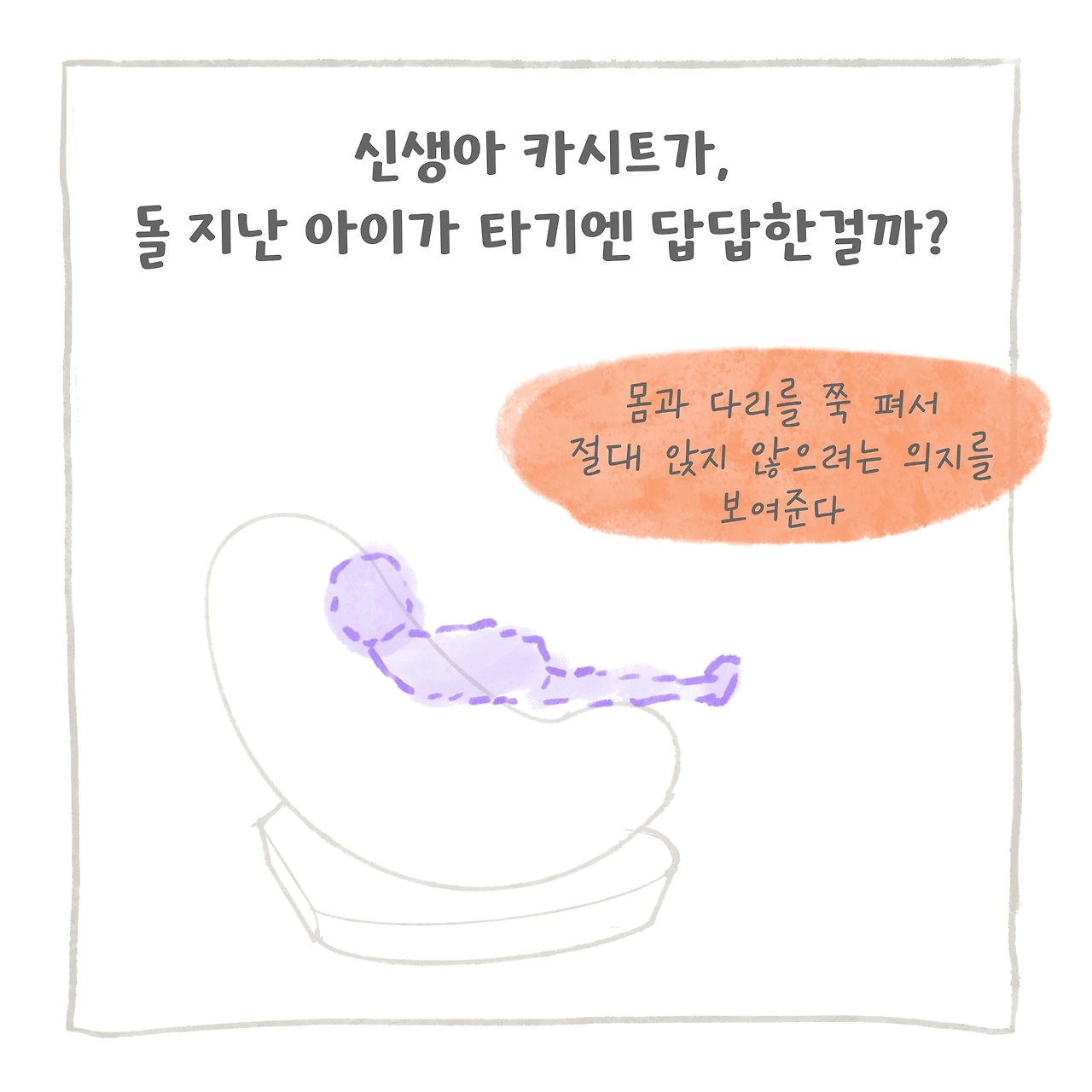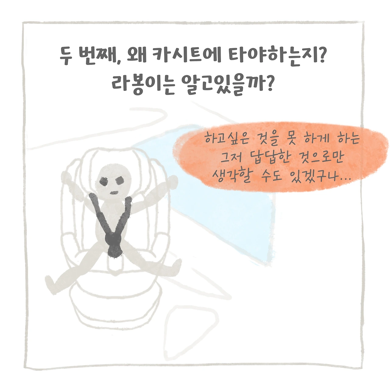 카시트 태우기 매일 아이와 씨름 중. 그렇다고 그냥 태울 수도 없고(카시트에 앉지 않고 차가 움직일 수 있다는 걸 알려주고 싶지 않다 ㅠㅠ) 택시만 타고 다닐 수도 없는 노릇이다. 가끔 바로 퇴근해서 픽업 가야 할 때 지하철-어린이집-집 동선으로 택시기사님에게 부탁한다. 그때는 아이가 새로운 차를 엄마랑 타서인지 곧잘 타기도 했고... 택시를 좋아하기도 하니 집 가는 길이 수월했다. 우리 차도 택시가 되어야 하나 ㅠㅠ 일단 엄마 또는 아빠가 옆에 있어야 하는데 아이홀로 뒤에 앉아야 하는 상황, 무언가 불편함이 느껴지는데 어디서부터 어떻게 해결할지 알지 못했다. 하나둘씩 어떤 이유일지 생각해 보고 아이의 입장에서도 생각해 본다. 그리고 라파와 이야기하여 몇 가지 시도할 것들을 정했다. 부디 효과가 있길 바라며!