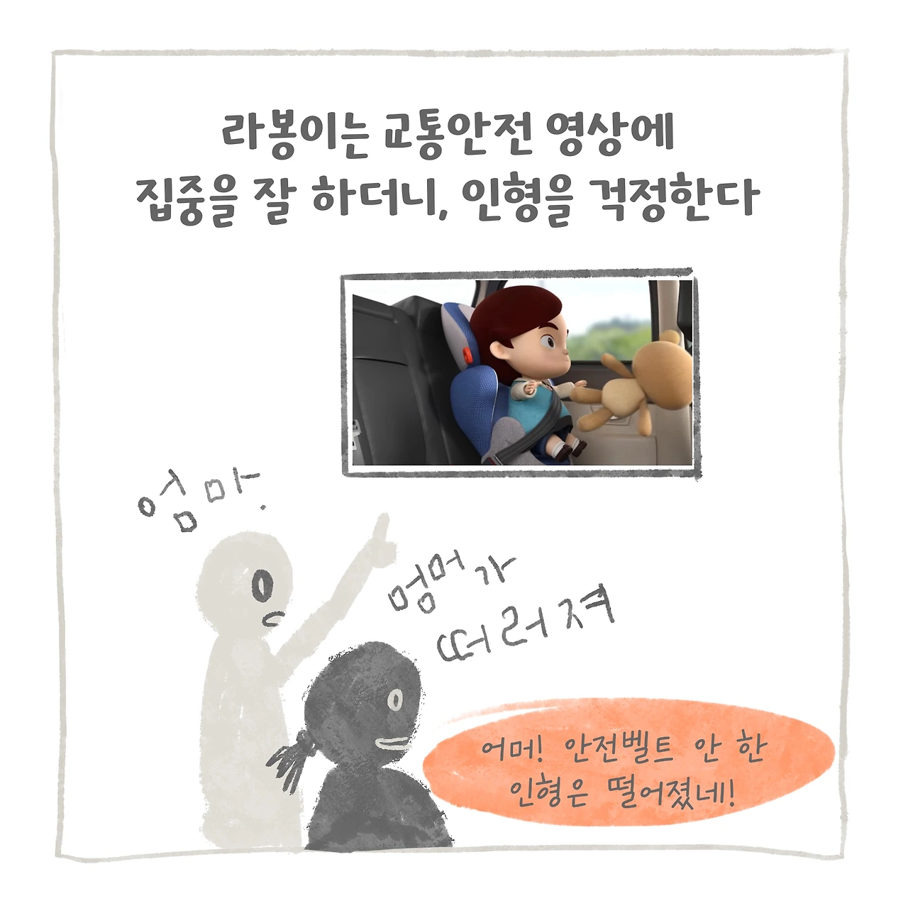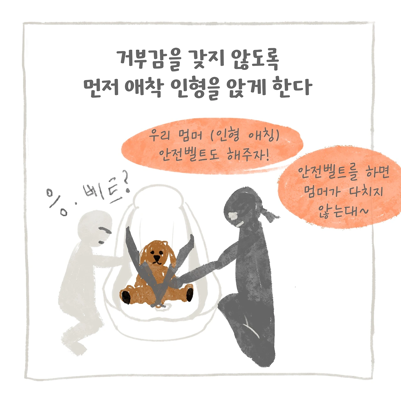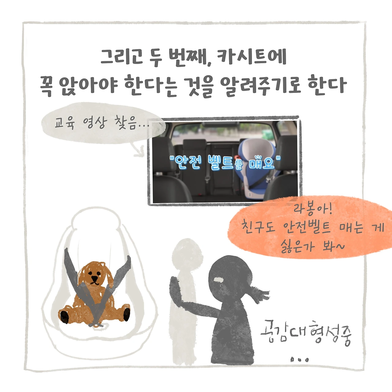 새로운 카시트를 마련했고, 새로운 의자 그리고 이 의자의 기능을 아이도 알기 쉽게 알려준다. 안전 관련 영상시청은 이미 어린이집에서도 본 이력이 있고, 교육 목적으로는 짧고 강력한 인상을 줄 수 있다고 생각해 선택했다. 물론 책이나 다른 방법으로 알려줄 수도 있지만, 아이가 바로 느낄 수 있는 방법으로 시도했다. 그리고 좋아하는 인형과 함께 부디 차에서도 잘 타주길 바라는 마음으로 차근차근 조급하지 않게 반복하며 알려주었다.