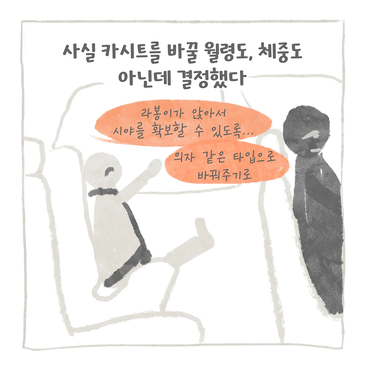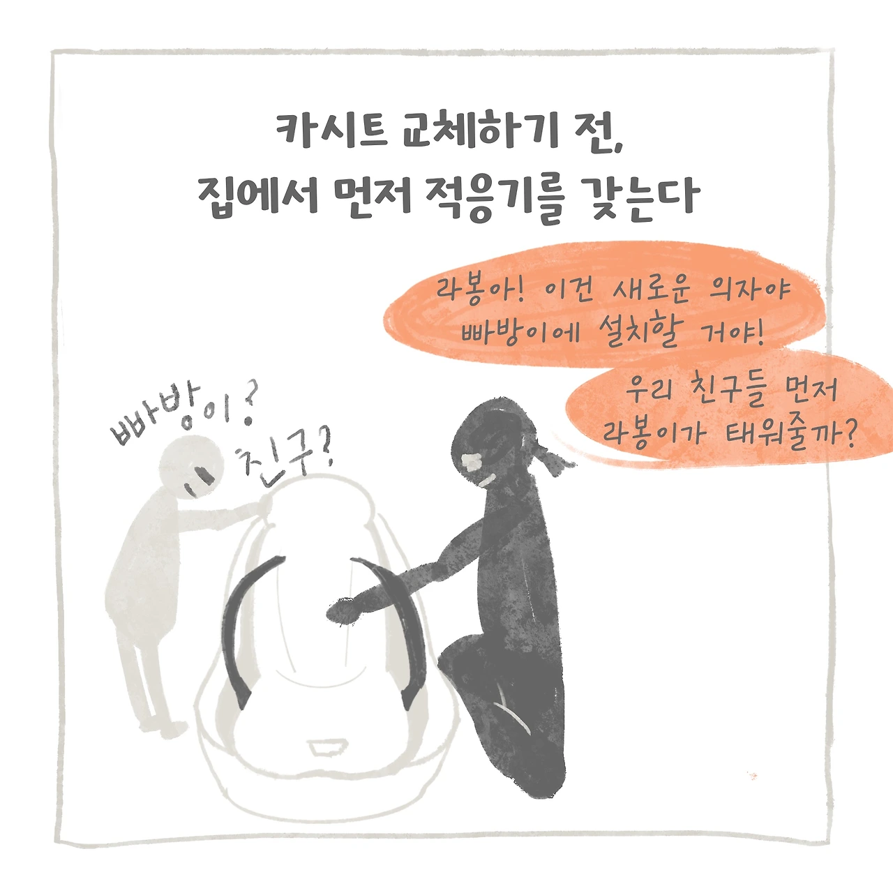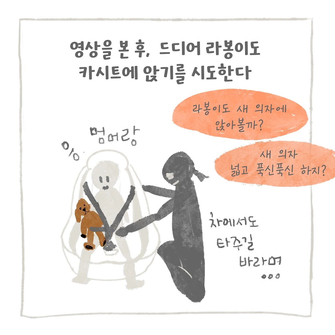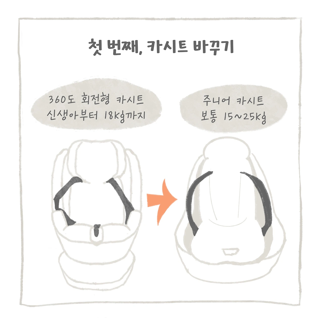 진심으로 맞벌이 그만둬야 하나 싶을 정도로, 아이 어린이집 등원이 힘들었다. 매일이 전쟁이었으니까. 그런데 생각해 보니 아이가 왜 힘들어하는지 이해하려 했을까? 또 아이에게 왜 카시트에 앉아야 하는지 얘기해 준 적이 있었나? 생각하니 미안해졌다. 차근차근 알려주기로 마음먹었다. 또 어릴 때부터 가만히 있지 않았던 라봉이 성향을 파악해서 최대한 신체적 자율성을 높일 수 있는 카시트 타입으로 바꿔주기로 결심했다. 주니어 카시트로 바꾸기엔 아직 어렸지만, 엄마처럼 앉고 싶어 했고 매일 상체를 들고 있는 아이를 보니 신생아 카시트가 답답했으리라 생각했다.