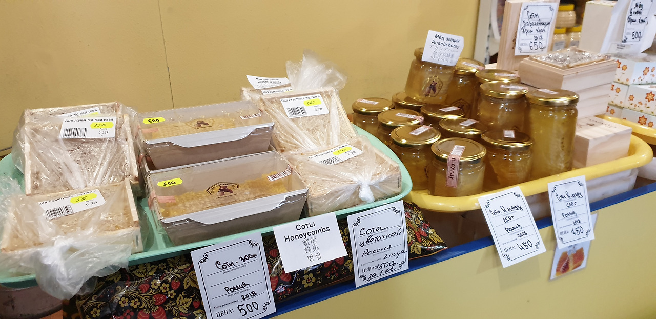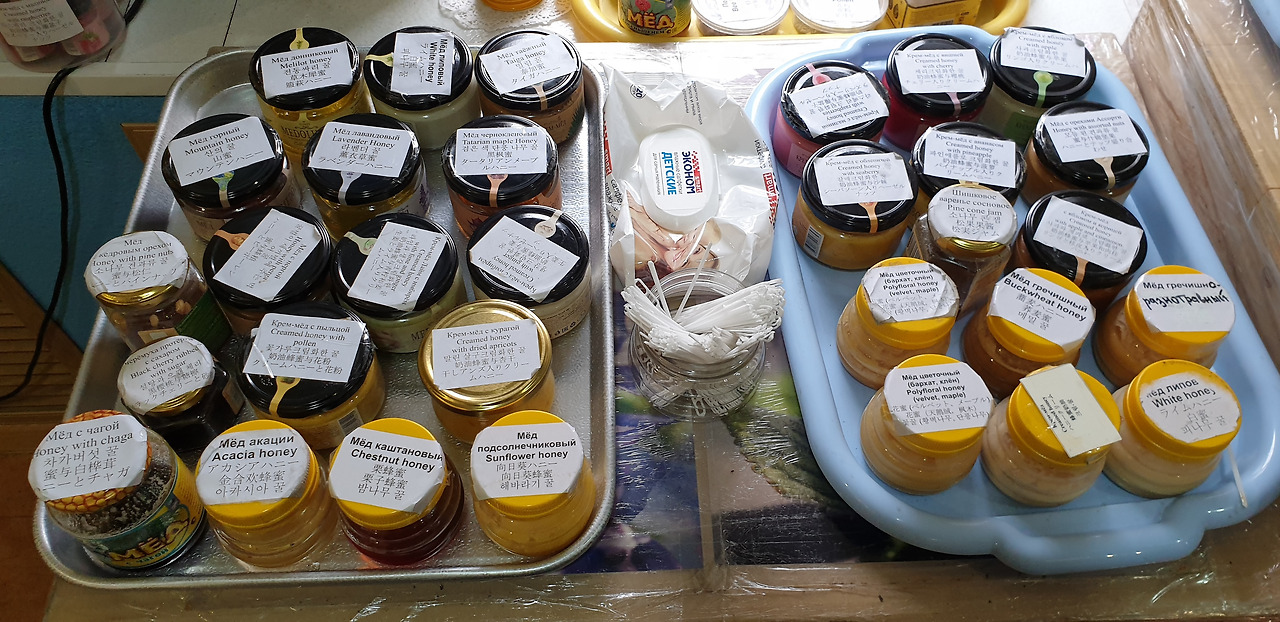 꿀이라고 하면 아카시아꿀, 유채꿀 이런 정도밖에 모르던 내 눈 앞에 신세계가 펼쳐졌다. 전동싸리꿀, 꽃가루크림화한 꿀, 말린살구크림화한 꿀, 갈매크림화한 꿀이 다 뭐인지. 벌집도 통째로 잘라서 팔았다.