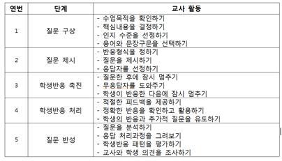 나. 질문의 의도가 이해되도록 명확하고 간결하게 하여야 한다. 학생들이 이해하기 쉽도록 어휘 선택과 문장을 구성하여 명시적이고 실제적인 내용을 중심으로 질문해야 할 것이다.