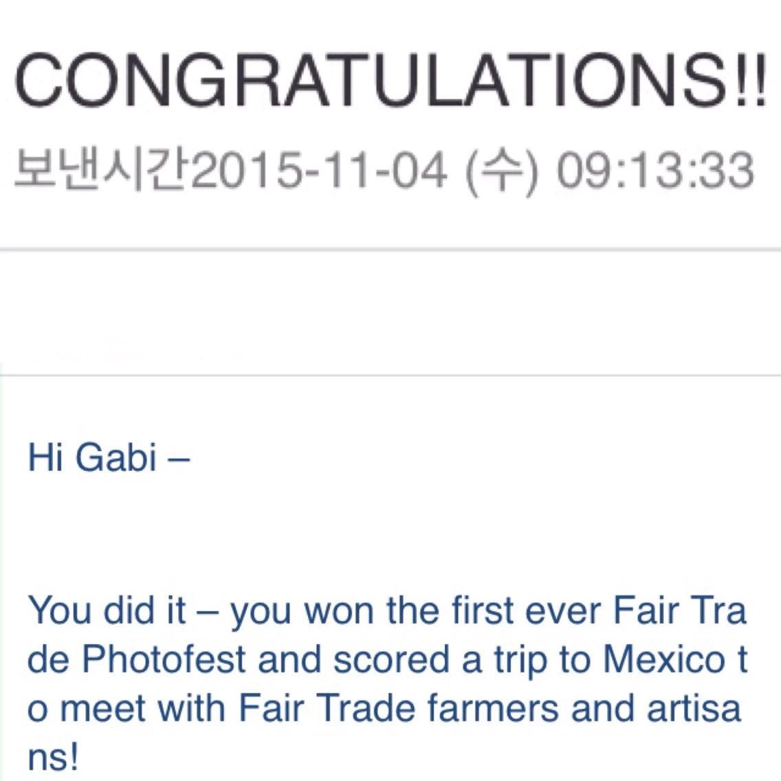 Actually, I could not let go of this opportunity so easily even when it looked like I have to give up. Three days before the last day of voting, I came to receive an email that I am not qualified for entry because I am not a citizen. I cried all day without thinking anything. Actually I thought desperately, “Why do I always fail whenever I face a challenge? Why do I fall down every time I try to step ahead from the past? How many times more do I have to fall down and overcome again and again till I grab the opportunity?” And that whole day, I kind of experienced what it would be like to live as an alien, a foreigner, in a certain society which I can’t belong to easily. The life of people who have come to Korea as a laborer, teacher and student. I could not accept the fact that I failed. At the very moment I was about to give up, thinking this might not be a my path to go, I remembered one sentence from the “terms and conditions” which the fair trade organization sent me at the very beginning of this contest, which says entries must be 'a legal resident of the USA' not a citizen. I read that many times and it didn't mention 'citizen.' And so, I asked politely about what I came to find out. And they sent me a link back, which showed me the definition of citizen and what I should do to be a citizen. Well, its not!!!!!!! I’m sure there is a huge difference between legal resident of USA and citizen! I emailed them back for more details and they said, "sorry for confusing you. I’ll email you back after we talk to our lawyer." In this way, I had to go through this process with incomplete English. I refused to yield to this situation just because of the barrier of language. I wanted to solve this problem by myself, using my voice regardless of what the result would be. And finally I got an email that I’m qualified. I was so excited as though I already won the trip to Mexico.