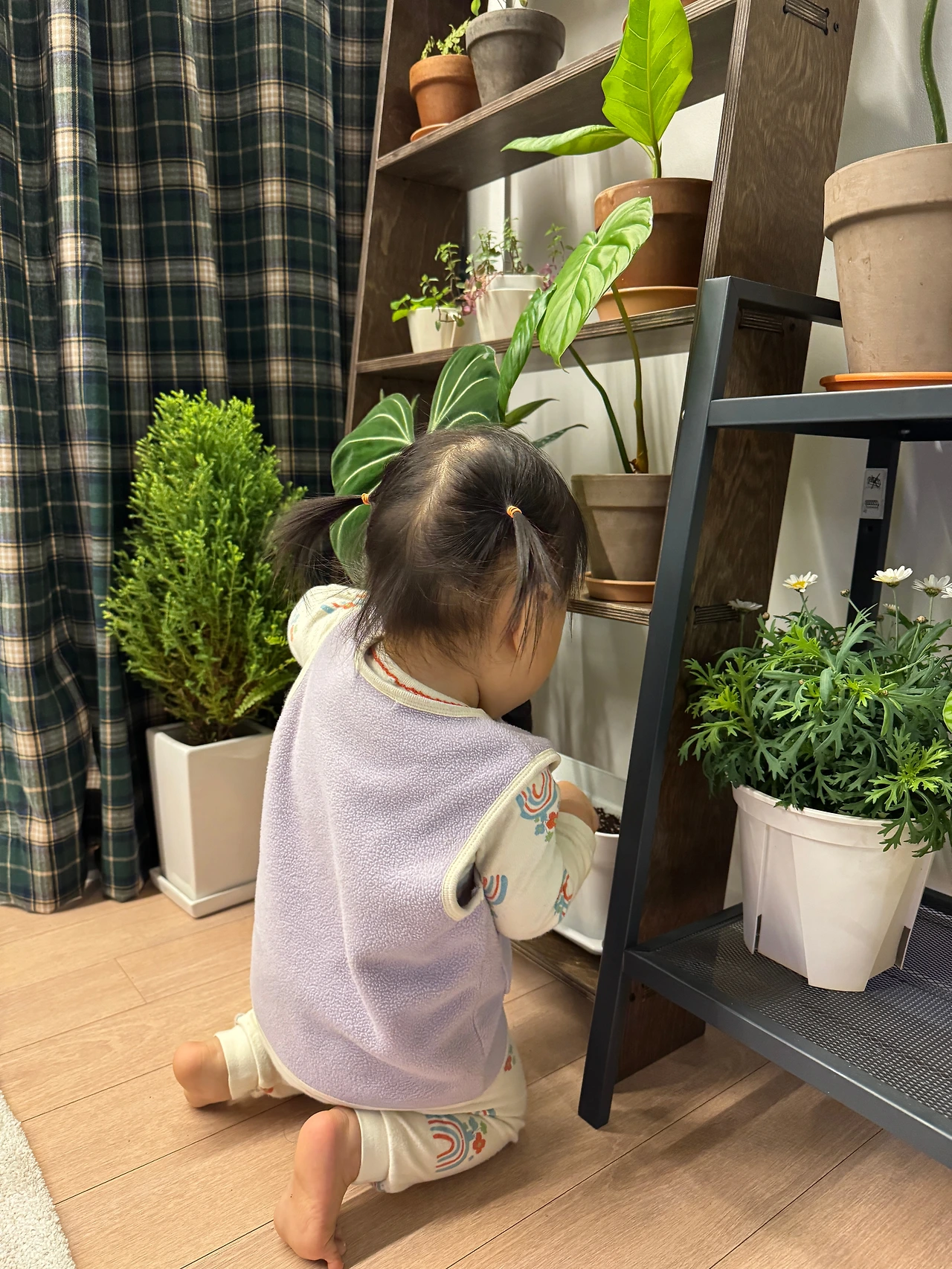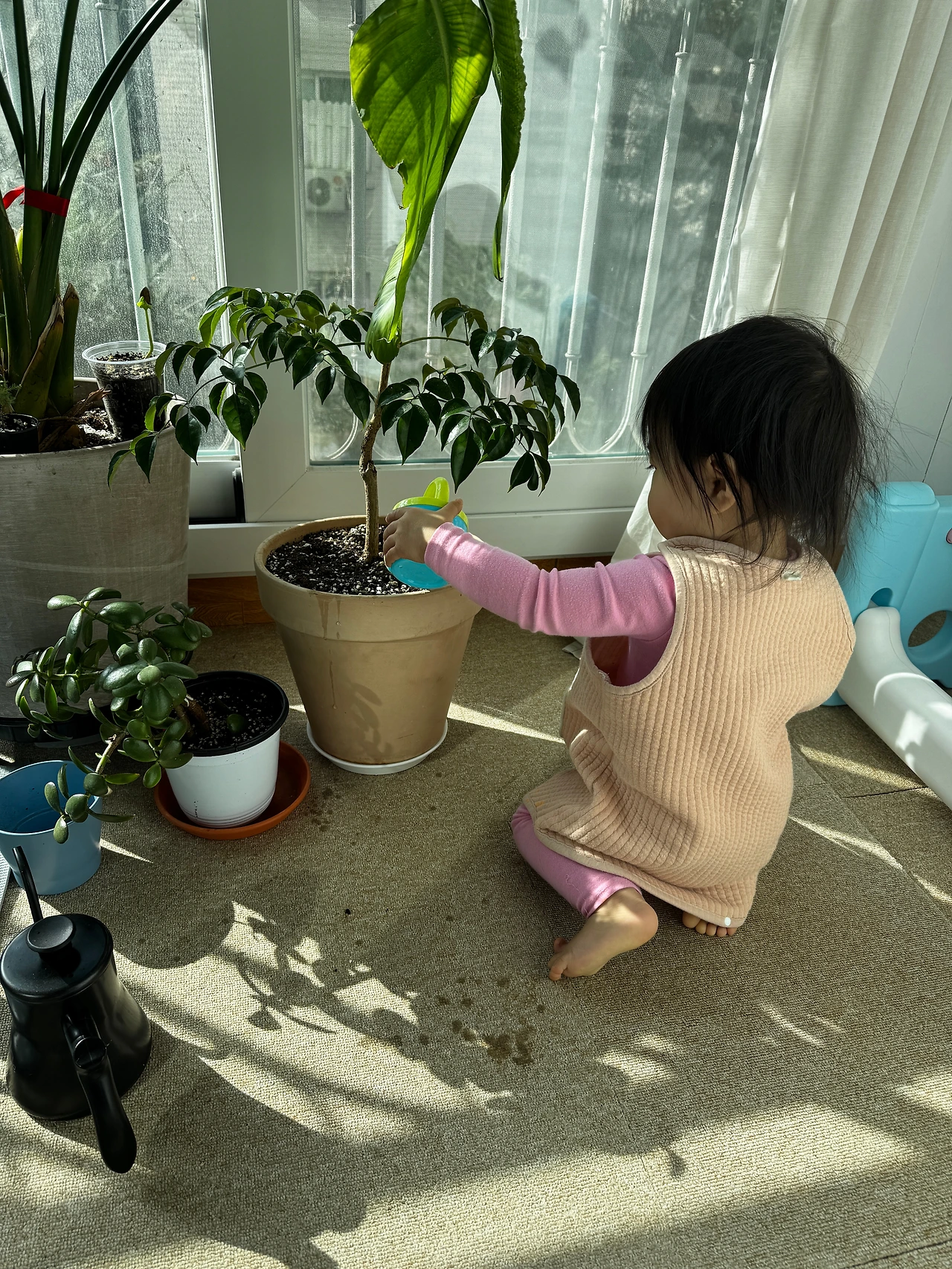 화분에 물을 주고 있으면 곧장 장난감 물조리개를 들고 와 자기도 하겠다고 물을 담아 달라고 하고, 식물에 아이 예쁘다 쓰담쓰담해줘 하면 “아 예쁘다 “ 하며 조심스레 식물을 쓰다듬어준다.