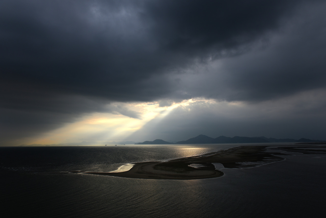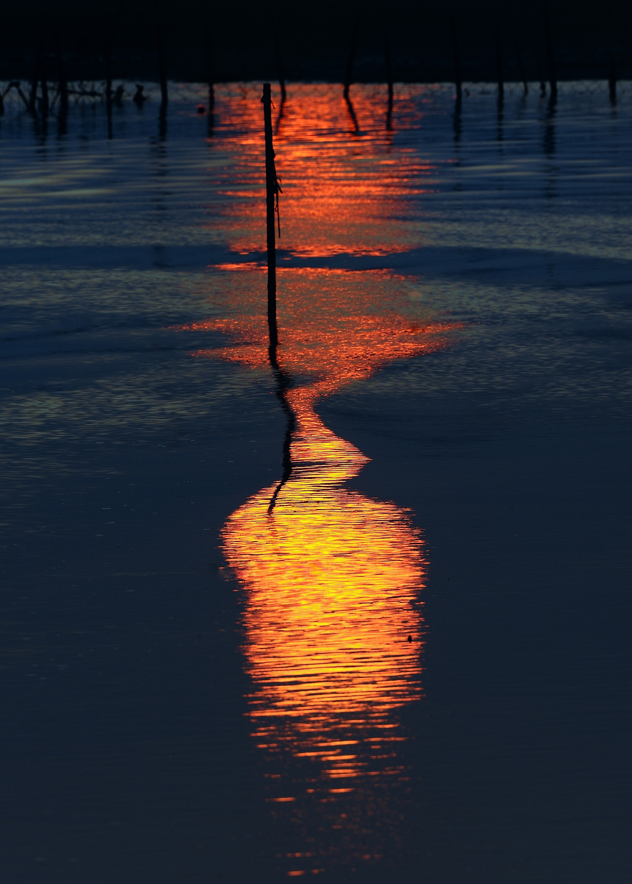 모래톱 낮은 여울가 흰점들로 수놓은 고니와