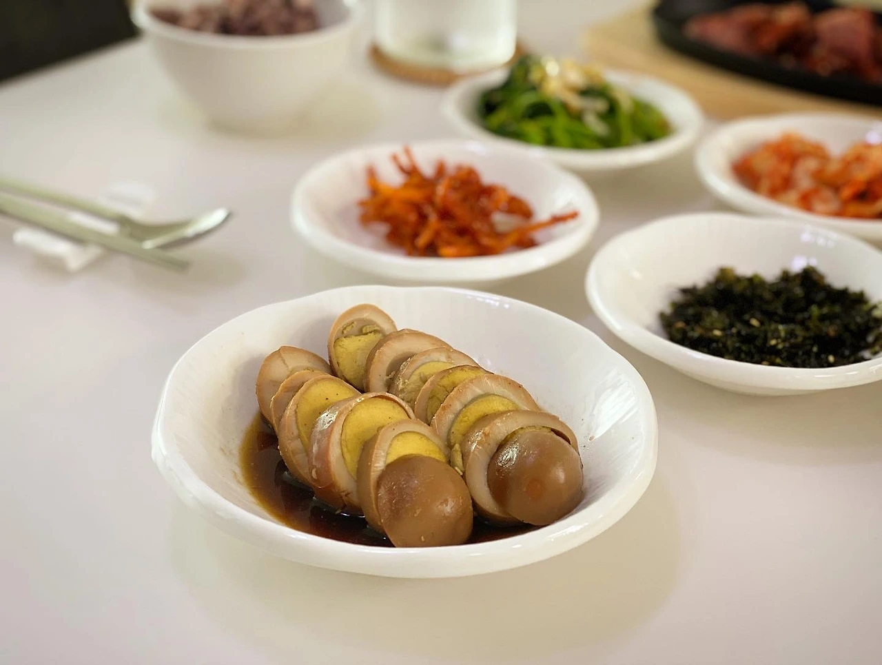 계란 장조림은 삶은 계란보다 이렇게 구운 계란으로 하는 것이 더 쫄깃하고 맛있다. 계란 껍질을 벗기는 것도 구운 것이 더 쉬워서, 나는 보통 계란을 삶기보다 굽는 편이다. 계란 장조림은 먹기엔 간단한데 계란을 익히고, 조리기까지 시간은 꽤 걸리는 반찬이다. 그래서 다른 반찬은 시간과 공수가 크게 들어가지 않는 것들로 차렸다.