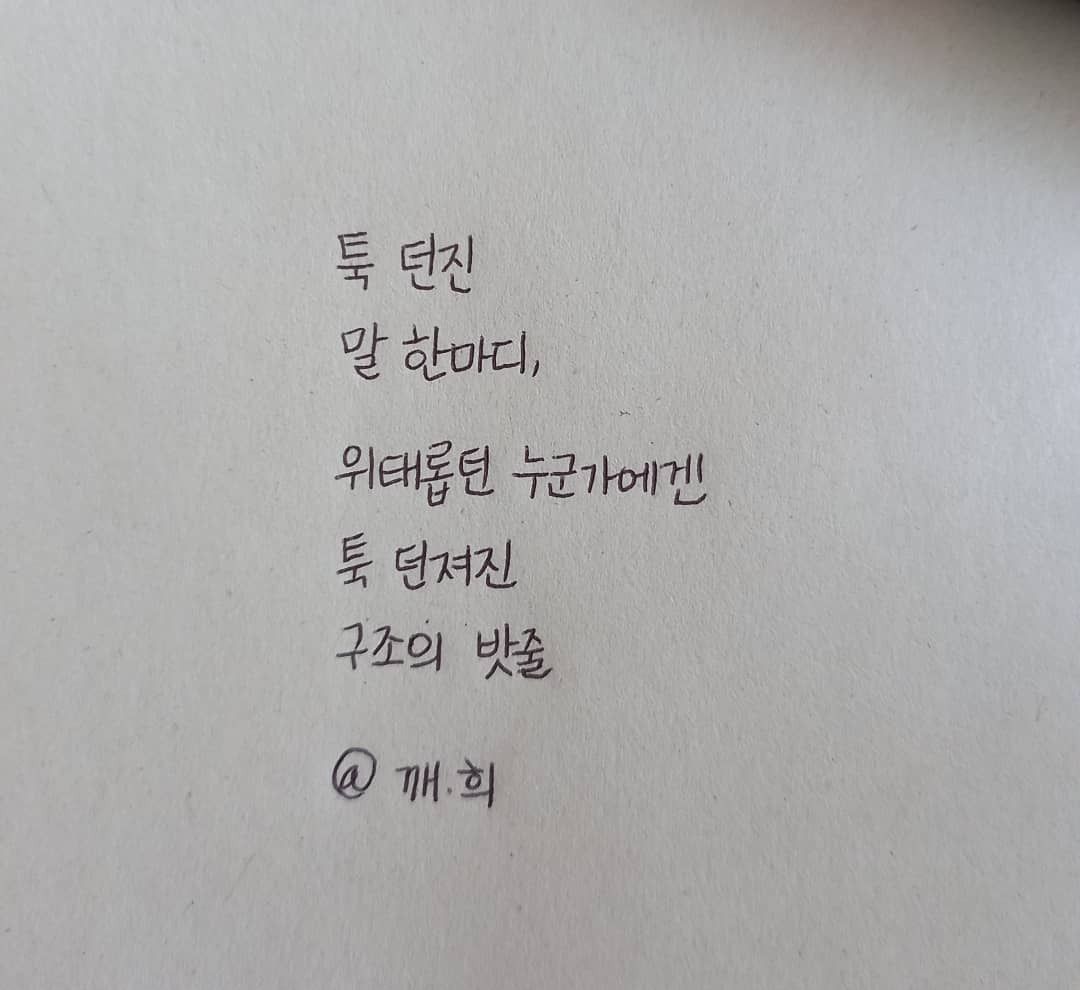 툭 던졌다고 가벼운 관심은 아니야.던졌던 그 마음은쉽게 지나칠 수 있었던 행동을 멈춘소중한 관심이거든.느슨해 보였던 그 관심도삶에 지쳐 위태로웠던 어떤 이에게는단단한 밧줄 같은 생명줄이 될 수 있으니조금은 여유를 내어조금은 가벼워도 되니사랑의 밧줄 '툭' 던져주길.