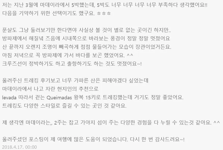 우리의 인연은 내가 첫 포르투갈 여행을 준비하던 때로 거슬러 올라간다. 얼굴도 몰랐던 그녀의 글은 마데이라로 향할 결심을 마치고도 이렇게까지 아무런 계획 없이 떠나도 되는지 염려하던 나에게 힘을 북돋아주었다. 그녀는 마데이라에 꼭 가야 한다고 강력 추천을 한다거나 마데이라 여행에 필요한 정보를 친절하게 알려주지 않았다. 그저 마데이라에서 매 순간 행복했음을 생동감 넘치게 말하고 있었다. 마데이라 여행 전후로 마데이라 곳곳을 누비며 즐거워하는 그녀의 감정이 고스란히 느껴지는 글을 읽고 또 읽었다. 이미 나 혼자 잔뜩 친밀해져서는 댓글이라고는 달아본 적 없던 눈팅 인생을 청산하고 구구절절 글을 남겼다. 그렇게 우리의 인연이 시작되었다.