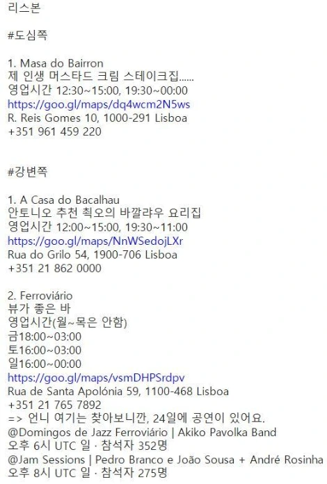 그래도 함께하면 좋겠다 싶은 몇 가지가 계속 떠올랐다. 추리고 또 추려서 딱 하나만 남겼다. 리스본에 올 때마다 꼭 들르곤 하는 레스토랑을 같이 가보고 싶었다. 그런데 이곳은 주요 관광지구와는 정 반대인 시내 깊숙한 곳일뿐더러 우리의 숙소와도 거리가 좀 있었기에 언니가 이곳을 멀다고 생각하면 안 갈 참이었다. 혹시 몰라 관광지를 조금 비껴 난 강변에서 가볼만한 곳도 현지인 친구의 추천을 받아두었다. 다 적고 나서 보니 가도 좋고, 안 가도 괜찮은 그런 마음이었다. 발길 닿는 대로 걷다가 Pingo doce 푸드코트에서 아무거나 집어서, 아무 데나 앉아서 먹어도 무엇이든 맛있게 추억할 우리였을 테니까.