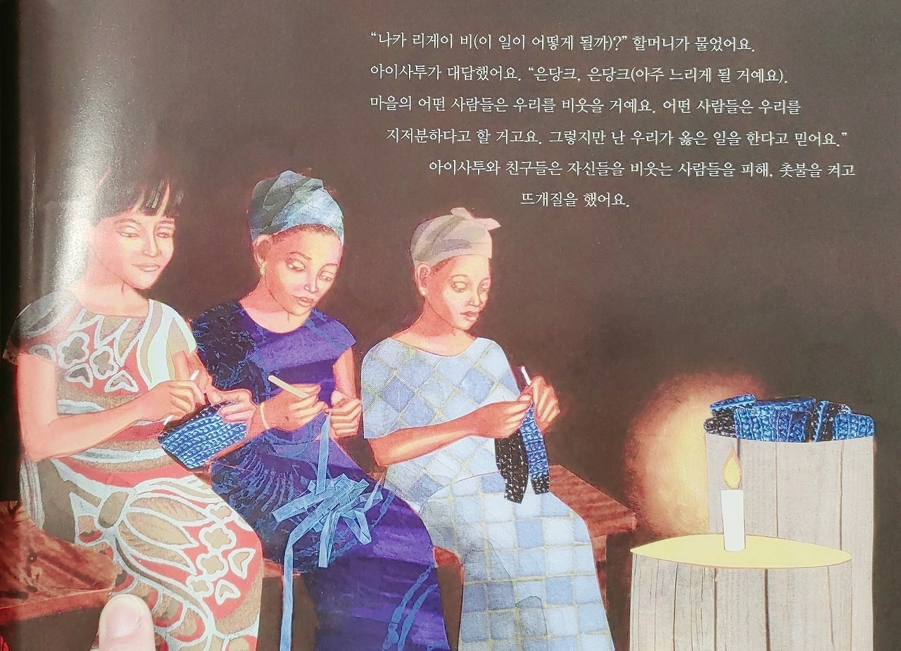 더러운 비닐봉지를 씻고, 자르고, 뜨게 바늘로 지갑을 뜨며 나누는 할머니와 아이사투의 대화가 가슴 찡하게 다가온다.