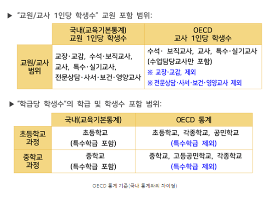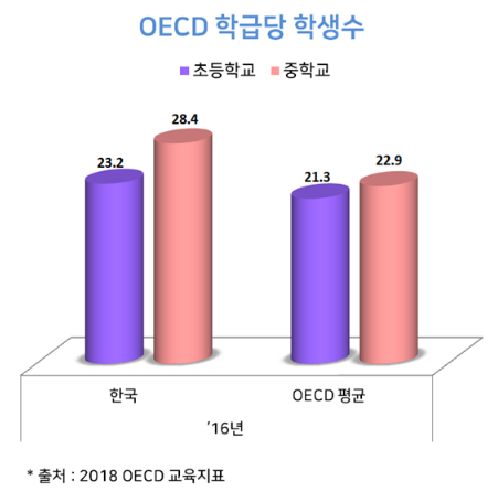 2018 OECD 교육지표에 따르면, 중학교 기준 OECD학급당 학생수 평균은 22.9명인데 비해, 한국은 28.4명에 달한다. 더군다나 한국의 통계치에는 '특수학급'을 포함시키고 있어 제대로 된 비교를 하기가 어렵다. (특수학급의 학생수는 기본교육법에 의거하여 10명으로 제한되어 있어 평균을 낮추는데 기여하고 있을 것으로 보인다.)
