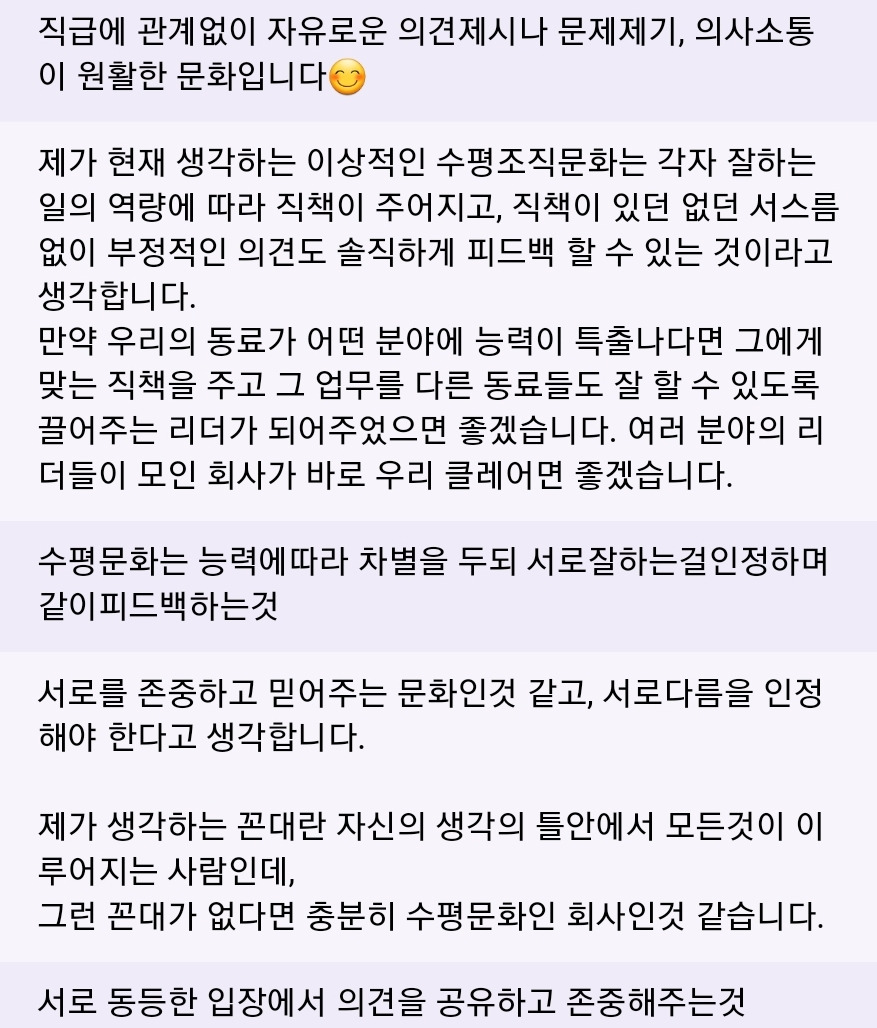 워크숍에 가서 수평적 조직문화가 무엇이라고 생각하는지 서로 공유도 했다. 그리고 각자의 의견들을 존중했다. (존중은 우리의 핵심가치 중 하나였다.)