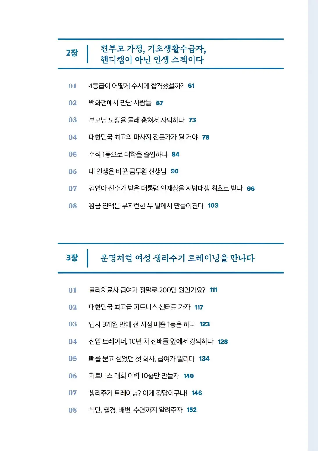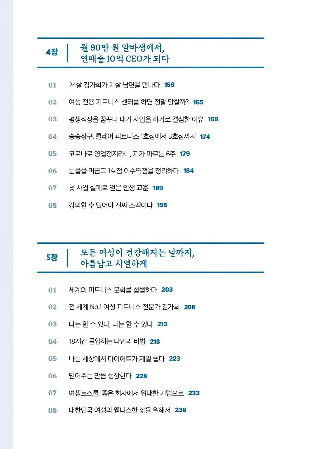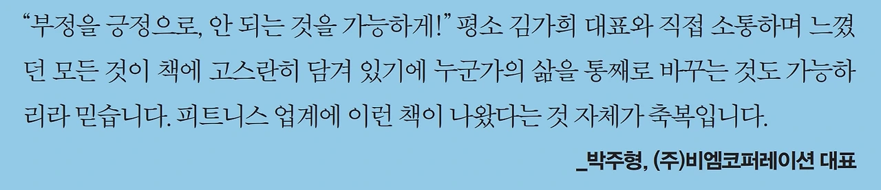 “부정을 긍정으로, 안 되는 것을 가능하게!” 평소 김가희 대표와 직접 소통하며 느꼈던 모든 것이 책에 고스란히 담겨 있기에 누군가의 삶을 통째로 바꾸는 것도 가능하리라 믿습니다. 피트니스 업계에 이런 책이 나왔다는 것 자체가 축복입니다. _박주형, (주)비엠코퍼레이션 대표
