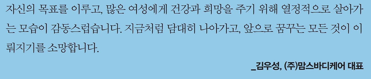 자신의 목표를 이루고, 많은 여성에게 건강과 희망을 주기 위해 열정적으로 살아가는 모습이 감동스럽습니다. 지금처럼 담대히 나아가고, 앞으로 꿈꾸는 모든 것이 이뤄지기를 소망합니다. _김우성, (주)맘스바디케어 대표