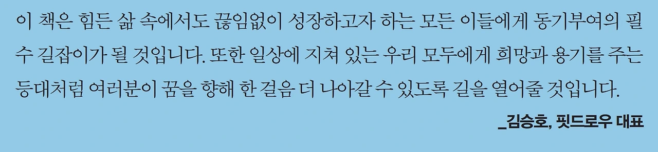 이 책은 힘든 삶 속에서도 끊임없이 성장하고자 하는 모든 이들에게 동기부여의 필수 길잡이가 될 것입니다. 또한 일상에 지쳐 있는 우리 모두에게 희망과 용기를 주는 등대처럼 여러분이 꿈을 향해 한 걸음 더 나아갈 수 있도록 길을 열어줄 것입니다. _김승호, 핏드로우 대표