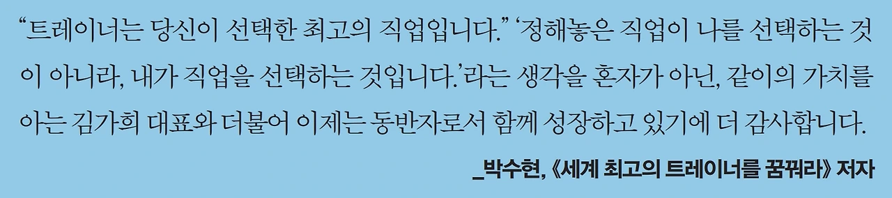 “트레이너는 당신이 선택한 최고의 직업입니다.” ‘정해놓은 직업이 나를 선택하는 것이 아니라, 내가 직업을 선택하는 것입니다.’라는 생각을 혼자가 아닌, 같이의 가치를 아는 김가희 대표와 더불어 이제는 동반자로서 함께 성장하고 있기에 더 감사합니다. _박수현,《세계 최고의 트레이너를 꿈꿔라》저자