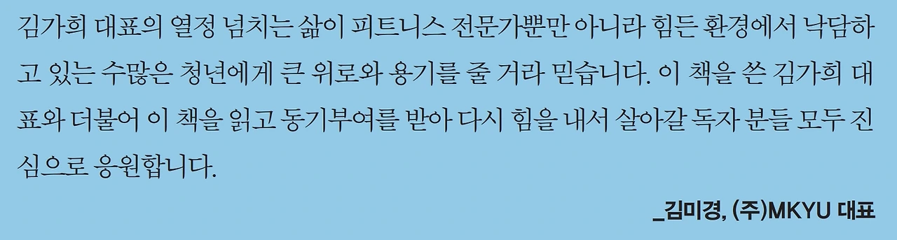 김가희 대표의 열정 넘치는 삶이 피트니스 전문가뿐만 아니라 힘든 환경에서 낙담하고 있는 수많은 청년에게 큰 위로와 용기를 줄 거라 믿습니다. 이 책을 쓴 김가희 대표와 더불어 이 책을 읽고 동기부여를 받아 다시 힘을 내서 살아갈 독자 분들 모두 진심으로 응원합니다. _김미경, (주) MKYU 대표