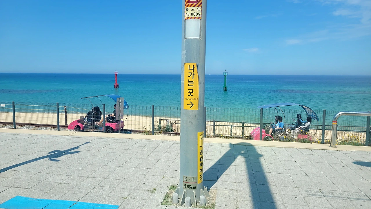 3호차에 올랐다. 누리호는 밝고 깨끗하며, 좌석 간 거리가 KTX보다 넉넉해 편안했다. 정시에 출발한 기차는 강릉역을 벗어나자 곧 농경지를 펼쳐 보였다. 8분 만에 동해의 청록빛 물결이 눈앞에 다가왔다. 속도를 줄인 기차 옆으로, 해녀들이 파도 사이에서 손을 흔든다. 그들의 미소가 정겹다. 터널을 지나며 창밖이 어두워질 때마다 기차 안도 살짝 고요해진다. 터널을 빠져나오자 정동진역이다. 레일바이크가 해안선을 따라 달리고, 파라솔 아래에는 사람들이 햇빛을 피해 모여 있다. 소나무숲과 긴 모래사장이 어우러진 해변이 눈을 사로잡는다.