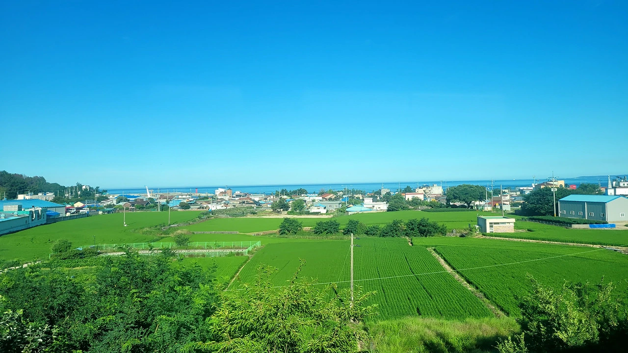 산과 산 사이, 다랭이 논이 펼쳐진다. 기성역에 다가가자 넓은 논 사이로 맑은 시냇물이 흐른다. 강릉의 강문해변보다 더 투명한 물빛에 눈이 맑아진다. 기성역에서 마주 오는 기차를 기다리며 3분 정차했다. 단선 구간의 여유로운 리듬이다. 후포역에 닿았다. 30년 전 동생 면회로 왔던 기억이 아련하다. 건축물 너머 바다가 병풍처럼 펼쳐지고, 집들은 한가롭게 흩여져 있다. 고래불역에선 바둑판같은 논과 소나무숲, 그리고 풍력터빈 세 개가 낮은 구릉 위에서 돌아간다. 풍경이 마치 한 폭의 수채화다.