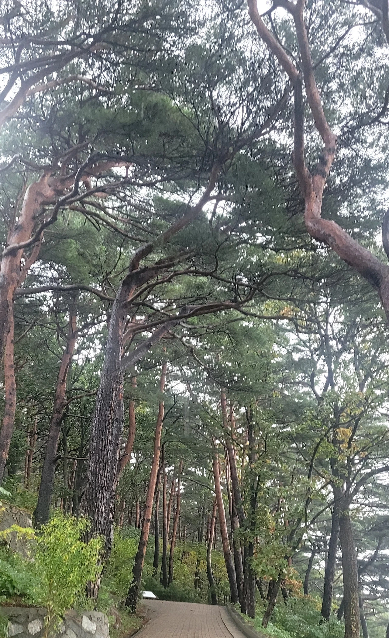 10월의 끝자락, 하늘이 잿빛으로 물든 그날, 사라, 소피아, 탐과 나는 차창 너머로 스며드는 빗줄기를 따라 화진포로 향했다. DMZ의 그림자 아래 자리한 이 지역은, 평화의 이름으로 포장된 채로 여전히 약간의 긴장과 신비를 품고 있다. 도로가 호수로 이어지는 순간, 화진포 호수가 갑자기 펼쳐졌다. 차창으로 스며드는 그 풍경은 숨이 멎을 만큼 아름다웠다. 호수는 거울처럼 고요하게 누워 있었고, 주변의 소나무 숲은 비에 젖어 더 짙은 녹색을 띠었다. 가을 단풍이 물안개 속에 희미하게 물들어, 마치 오래된 수채화처럼 아련하게 번져 나갔다. 고요한 호수 표면에 빗방울이 떨어질 때마다, 작은 원들이 퍼지며 세상의 비밀을 속삭이는 듯했다. 주차장에 도착했을 때, 물안개가 엷게 앉아 있었다. 우산을 펼쳐 비를 가리며, 나는 조심스레 발을 내디뎠다.