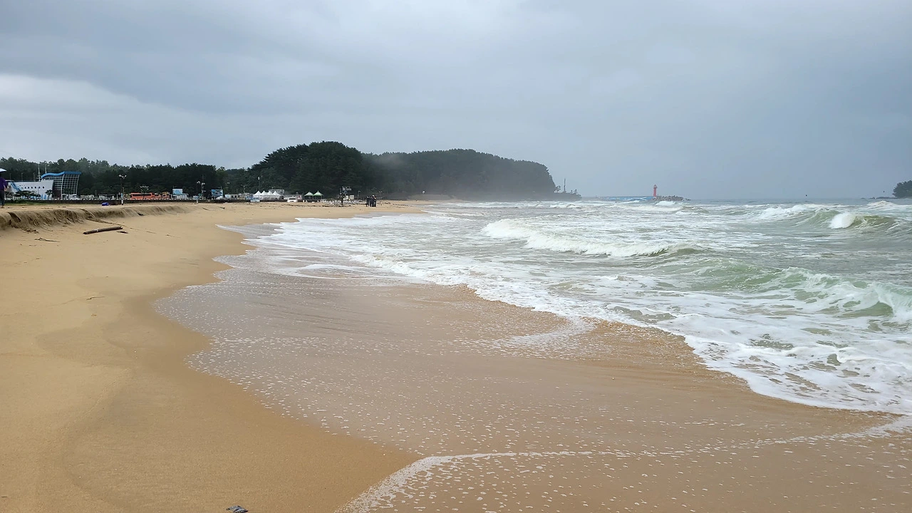 우리는 차를 타고 화진포 해수욕장으로 이동했다. 나는 비가 조금 잦아든 틈을 타 우산을 접고, 신발을 벗은 후 모래 가득한 해변으로 걸어 들어갔다. 발가락 사이에 스며드는 고운 모래는, 바다의 숨결처럼 부드러웠다. 맨발로 걷는다는 건, 자연과 직접 대화하는 일이다. 파도가 발등을 핥아 올릴 때마다, 짠내와 비 냄새가 뒤섞여 코끝을 간질였다. 저 멀리, 북한의 산맥이 안갯속에 희미하게 떠 있었다. 그 경계선이, 오히려 이 풍경을 더 소중하게 만들었다. 나는 카메라를 들었다. 한 장의 사진에 파도의 곡선, 소나무의 실루엣, 그리고 비에 젖은 하늘을 담았다. 동영상 모드로 전환해, 파도가 부서지는 순간과 바닷소리를 녹화했다. 그때, 바람이 속삭이듯 말했다. "여기서 멈추지 마. 이 모든 걸 느껴봐." 밀려오는 파도에 온몸을 맡기고 싶은 충동이 일어났다.