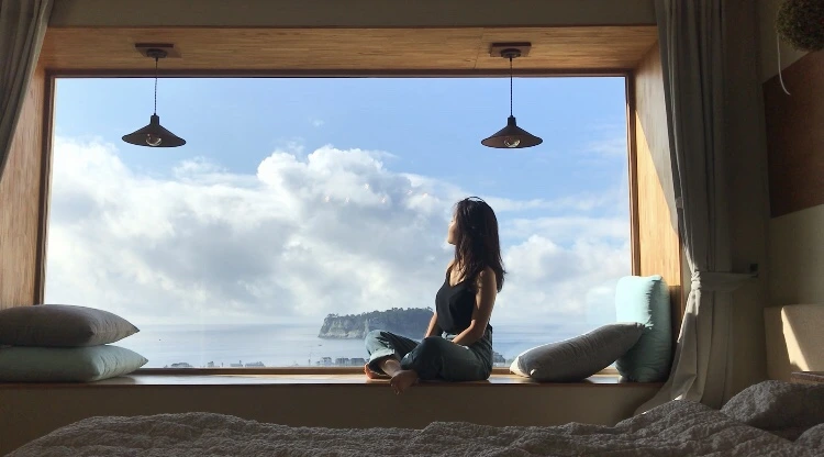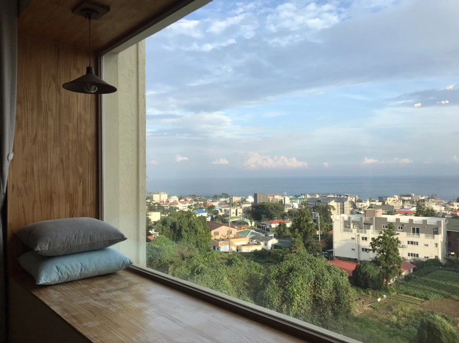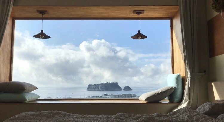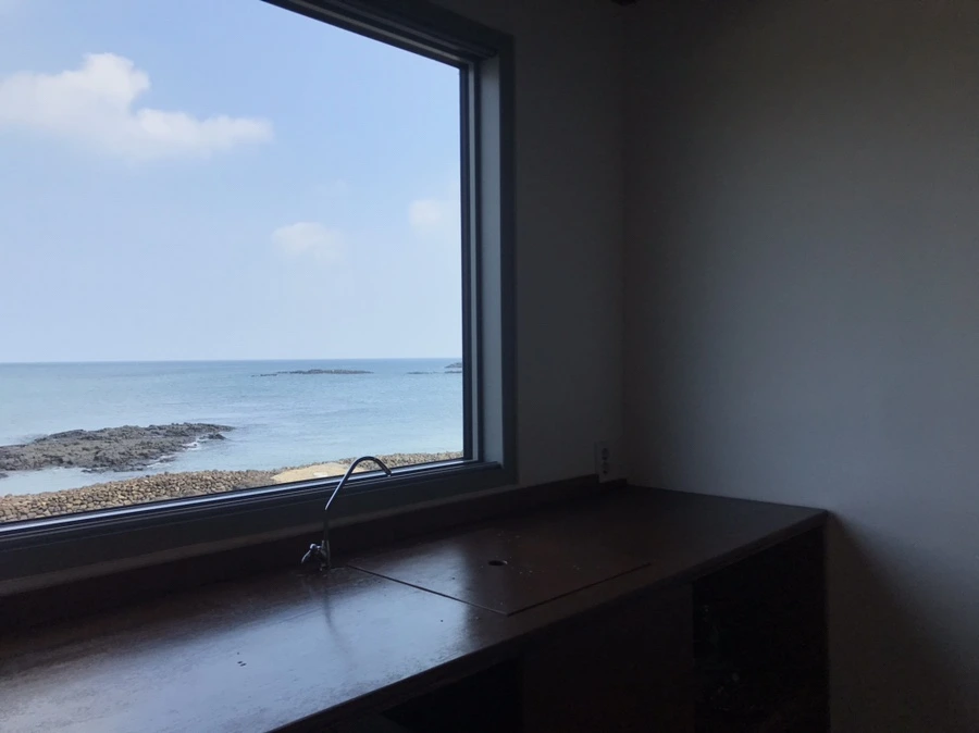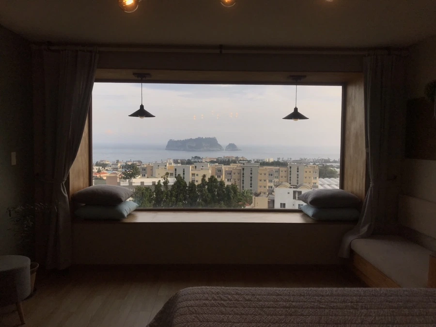 아주 큰 창 밖으로 범섬이 한눈에 다 보인다.