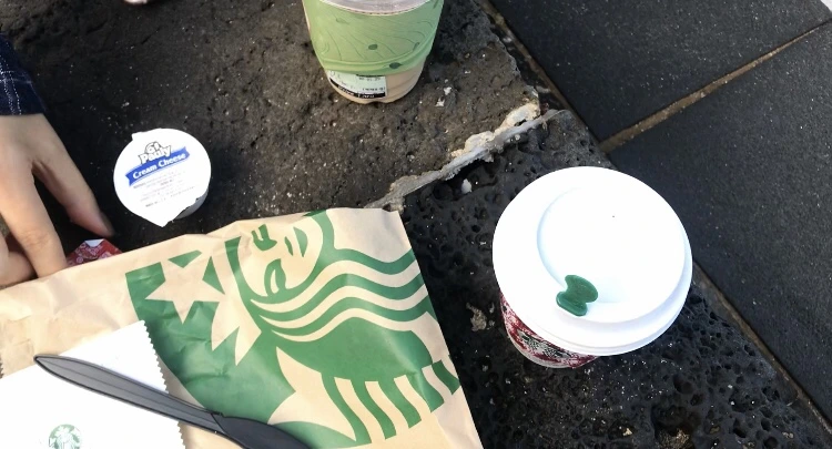돌계단에 앉아서, 치즈 베이글이랑 커피로 아침 때우기