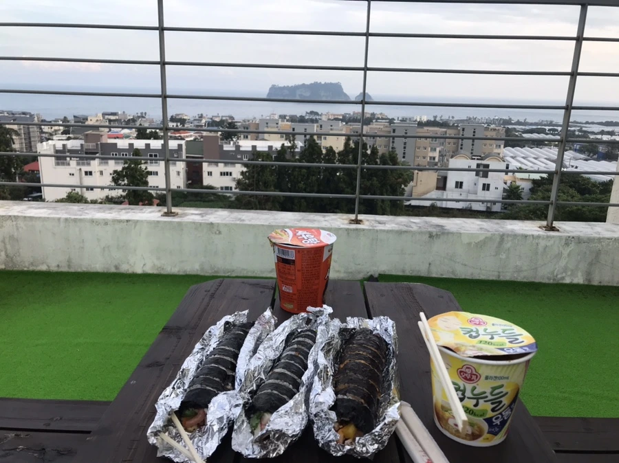 테라스에 앉아서 구름이랑 범섬 보면서 먹었다.