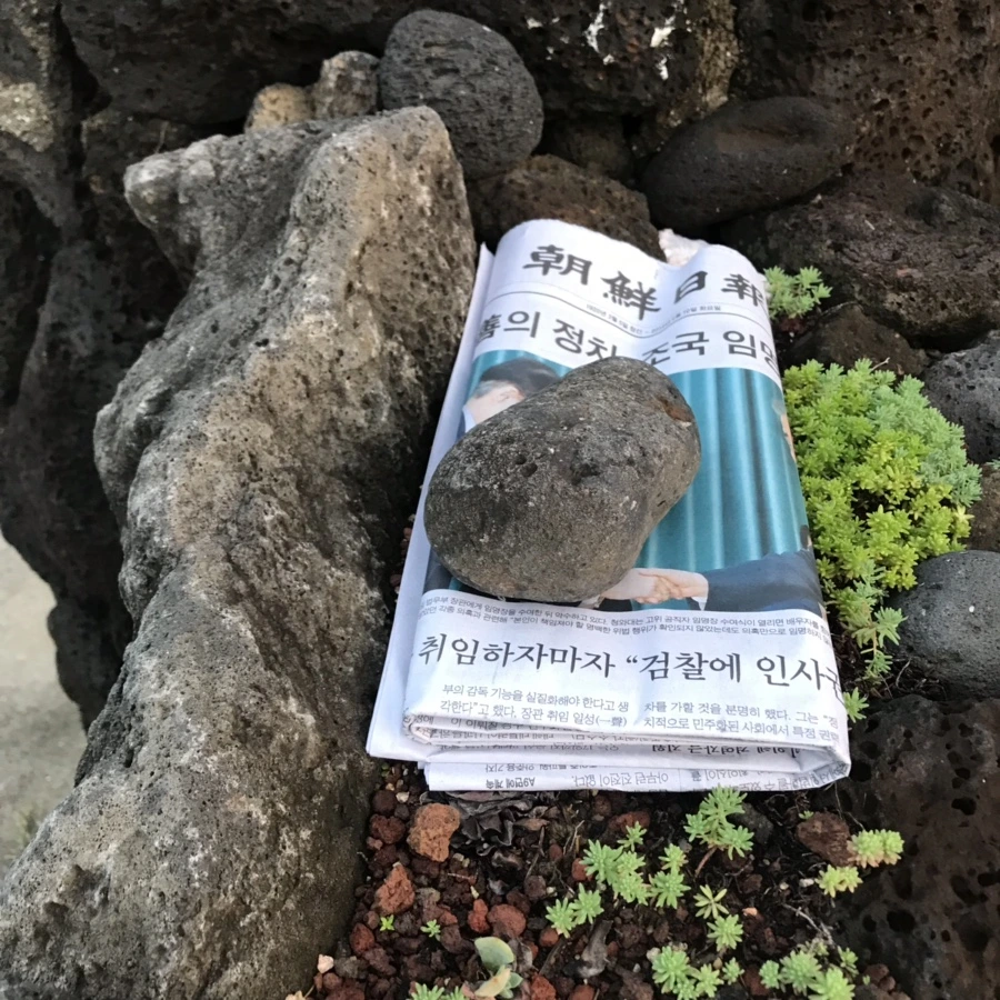 새벽 제주 바람에 신문이 날아가지 않게, 돌멩이를 올려놓은 걸 보니