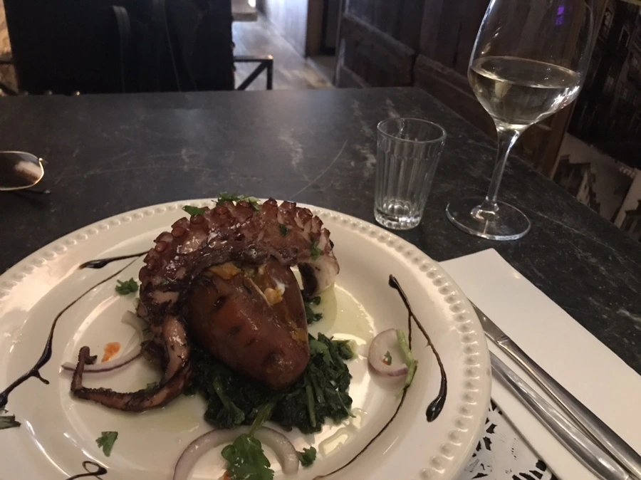 살짝 짭조름하지만 부드럽고 맛있게 잘 삶어진 문어에 아래는 달콤한 통고구마 & 사워 소스 그리고 이름 모를 초록색 야채가 깔려있다. 결론적으로 엄청 맛있었다. 가격은 16유로로 비쌌지만, 첫 도전치고 굉장히 만족. 괜찮은 식사를 했다는 기분이 들었다.