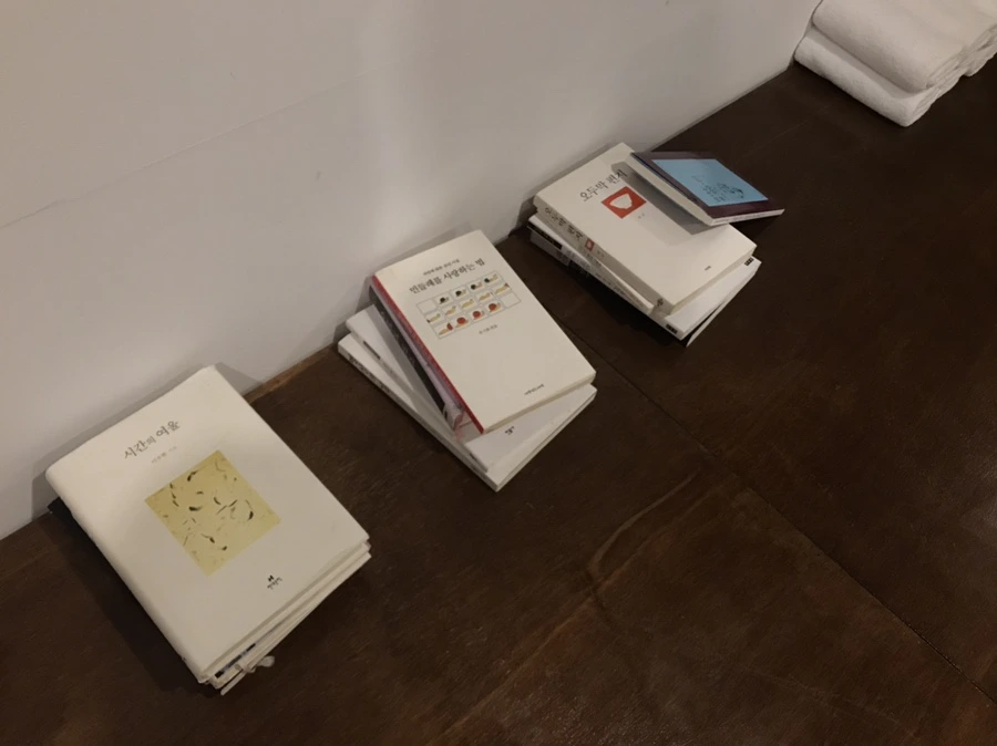 세워져 있는 책들과, 방명록과. 그냥 놓여있는 것도 아니고 일부로 살짝 비틀어 자연스럽게 배치해두셨는데
