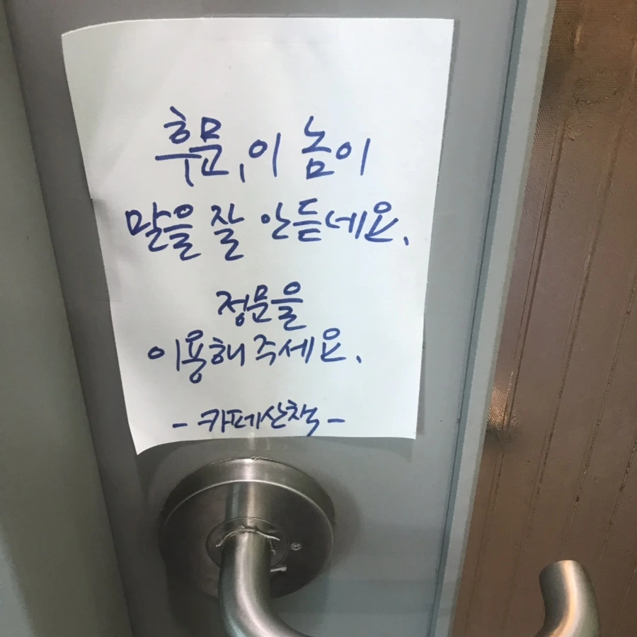 편의점 문 손잡이에 붙어 있는 당깁서예도.