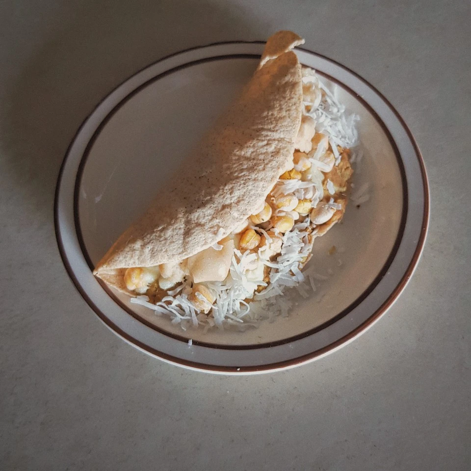 1. 삶은 병아리콩 한 줌, 코코넛 플레이크 한 줌, 현미 가래떡 1개, 고구마 무스(삶은 고구마+무가당 요구르트+시나몬가루+알룰로스 올리고당+땅콩버터), 피자치즈 한 줌, 통밀 토르티야 1개를 준비한다.