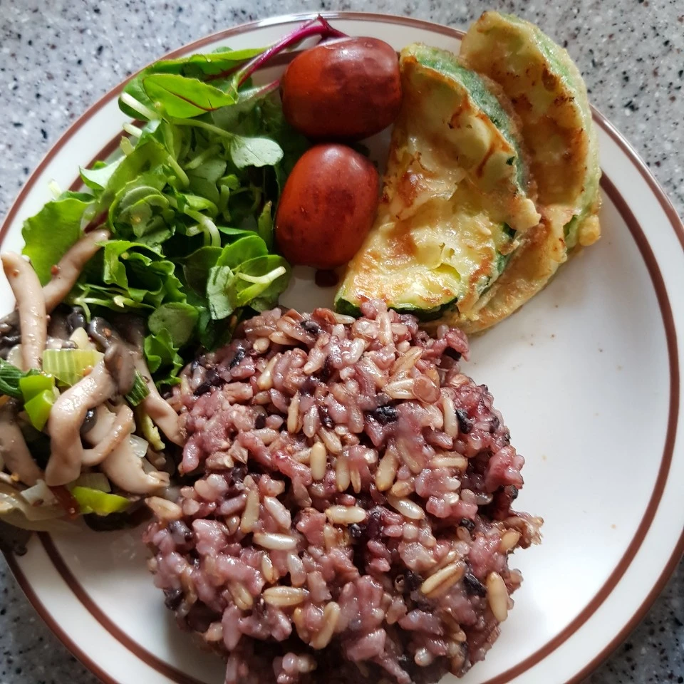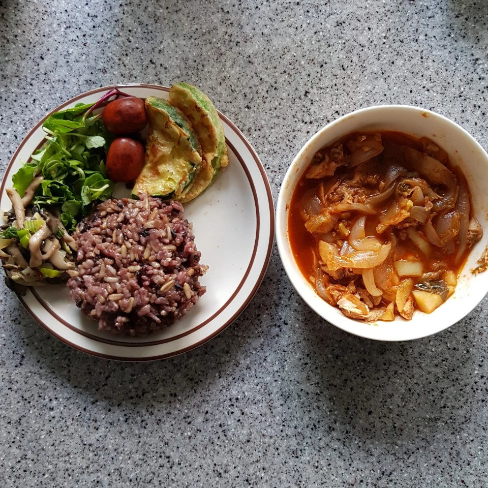 어린잎채소 20g, 닭볶음탕 고기 150g (뼈 무게 포함), 버섯 50g, 호박전 2개, 닭볶음탕 국물, 잡곡밥(렌틸콩, 귀리, 검정찹쌀보리, 흰쌀, 현미찹쌀) 130g