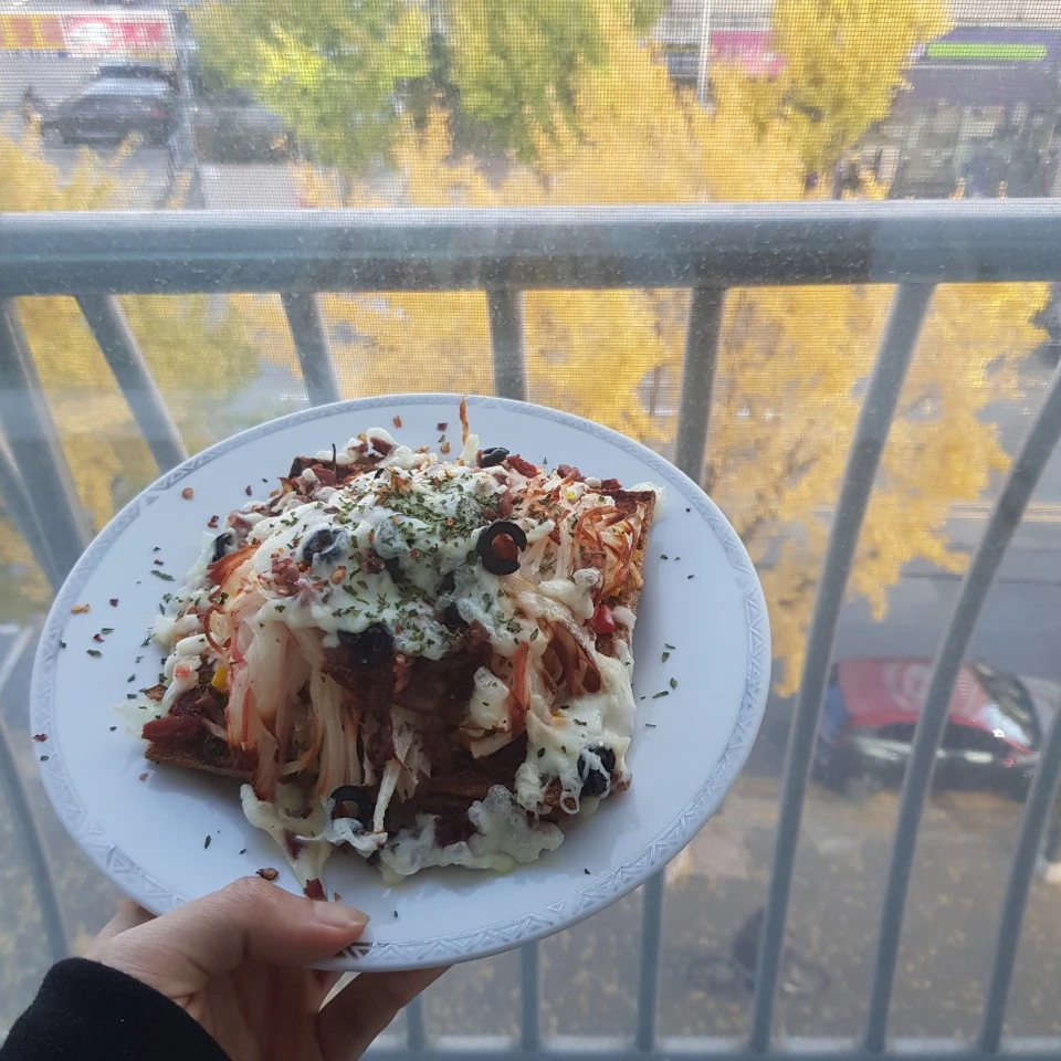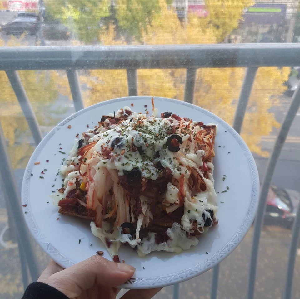 잘 상상이 안 가는 조합이지만, 먹고 나서 오, 나 천잰가 했다. 역시 아는 맛은 무섭다. 이 맛을 많은 사람이 알면 좋을 텐데! 통밀 과자의 약간 시고 바삭바삭한 맛이 에어프라이어에 돌리니까 더 강해지고, 배의 퍼석아삭한 식감과 게맛살의 쫄깃 달 큰 감칠맛이 어우러지고 토마토소스가 피자라는 자기주장을 해주고, 블랙 올리브가 씹는 재미를 업시켜주고 짭짤한 훈제오리가 간을 확 잡아준다. 약간 바삭한 정도로 구워진 사이드의 치즈와 쭈욱 늘어나는 중앙의 짭짤하고 고소한 치즈가 그야말로 헤븐! 파프리카가 씹히면 달큼하면서 아삭한 식감이 더 행복감을 가져다준다. 아침을 건너뛴 게 너무 오랜만이라 어색하고 약간 걱정스럽기도 했지만, 운동을 한 것도 뿌듯하고, 맛도 있어서 행복하게 먹었다. 혼자 먹었고, 빅뱅이론과 함께 했다!