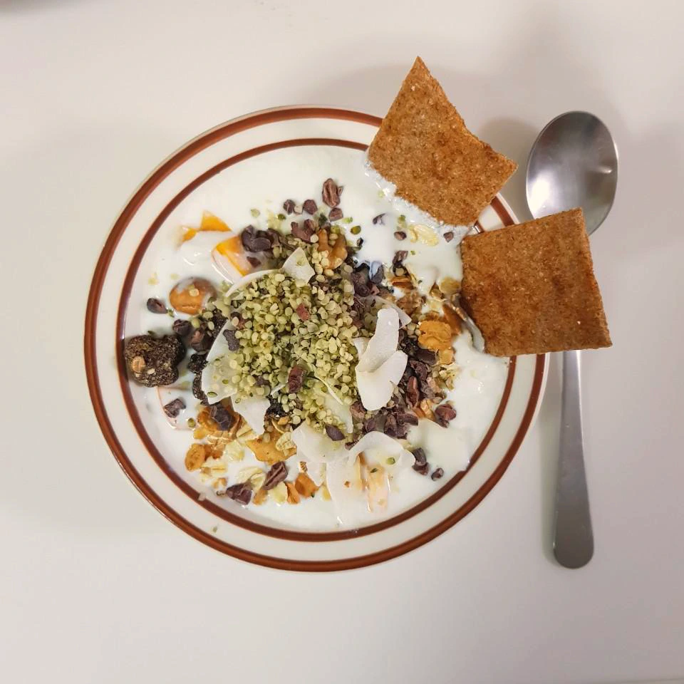 무가당 수제 요구르트 163ml, 코코넛 슬라이스 9g, 햄프 시드 5g, 카카오 닙스 5g, 뮤즐리 16g, 단감 반 개, 브라질너트 2개, 사차인치 5-6개, 아몬드 4-5개, 호두 1개, 핀 크리스프(통곡물/통밀 과자) 1개