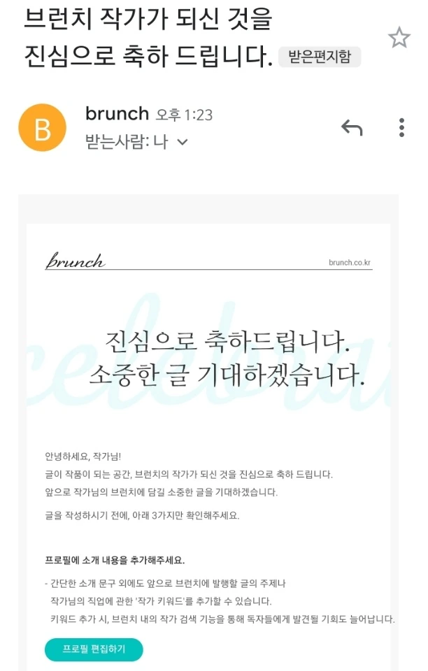 시나리오 작가가 되기를 꿈꾸면서 온 대학에서 작가가 되기를 포기하면서 내가 어떤 사람인지를 다시 정립해야 했다. 그래서 2번째 사춘기를 겪으면서 방황의 한 부분으로 전공과는 전혀 관련 없는 분야를 탐색하면서 다이어트를 시작했다. 다이어트를 덕질하다가 보니 식단일기를 쓰는 것이 다이어트를 오래 지속할 수 있는 가장 효과적인 방법이라는 것을 알게 됐고, 다이어트 식단 기록 인스타그램 계정을 만들어서 기록을 시작했다. 그러다 사진 중심의 플랫폼인 인스타그램에 지금과 같이 글 중심으로 식단을 기록하는 것이 비효율적이라고 느꼈고, 그래서 글 중심의 플랫폼을 찾아보게 됐다. 블로그는 인스타그램을 시작하기 전에 시도했다가 그만둔 전적이 있어서 다시 도전해볼 용기가 나지 않았다. 시작도 전에 실패한 경험을 안고 가야 할 것 같았다. 그래서 바로 떠오른 플랫폼이 브런치였다. 브런치 초기에 그냥 끄적이는 용도로 한두 번 사용했던 적이 있었기 때문이다. 인스타그램에 매일 쓰는 것처럼 가볍게 매일매일 브런치에 써보자란 마음으로 쓴 한 편의 글이 브런치 작가라는 타이틀을 가져다주다니! 정말 인생이란 흥미진진하고 때론 어리둥절하다.