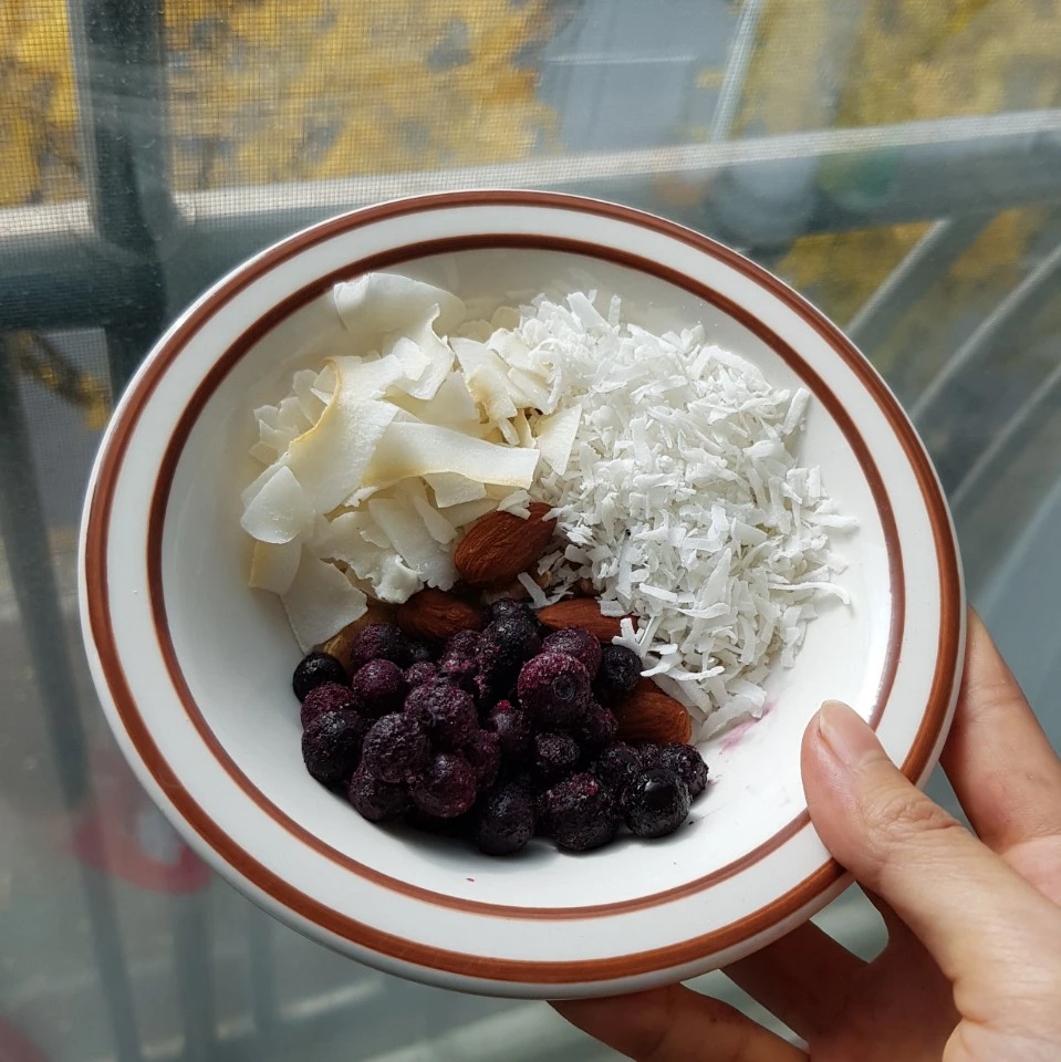 4. 블루베리 한 줌 반, 아몬드 5알, 브라질너트 2알, 사차인치 5알, 코코넛 플레이크 10g, 코코넛 슬라이스 10g, 호두 1알을 곁들여 먹는다. (토핑은 취향껏 선택한다.)